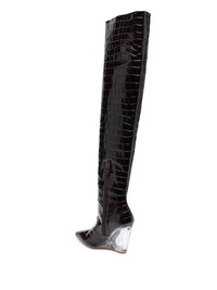 Lucite 100mm thigh-high boots Stuart Weitzman's bold, confident spirit underpins the amped-up construction of these black thigh-high boots. Crafted from mock croc leather, they're detailed with a transparent wedge heel for a dynamic finish. Imported Composition Outer: Calf Leather 100% Lining: Calf Leather 100%, Fabric 100% Sole: Calf Leather 100% SIZE & FIT Measurement CIRCUMFERENCE 17.32 in(44 cm) HEEL 4.33 in(11 cm) HEIGHT 24.8 in(63 cm)