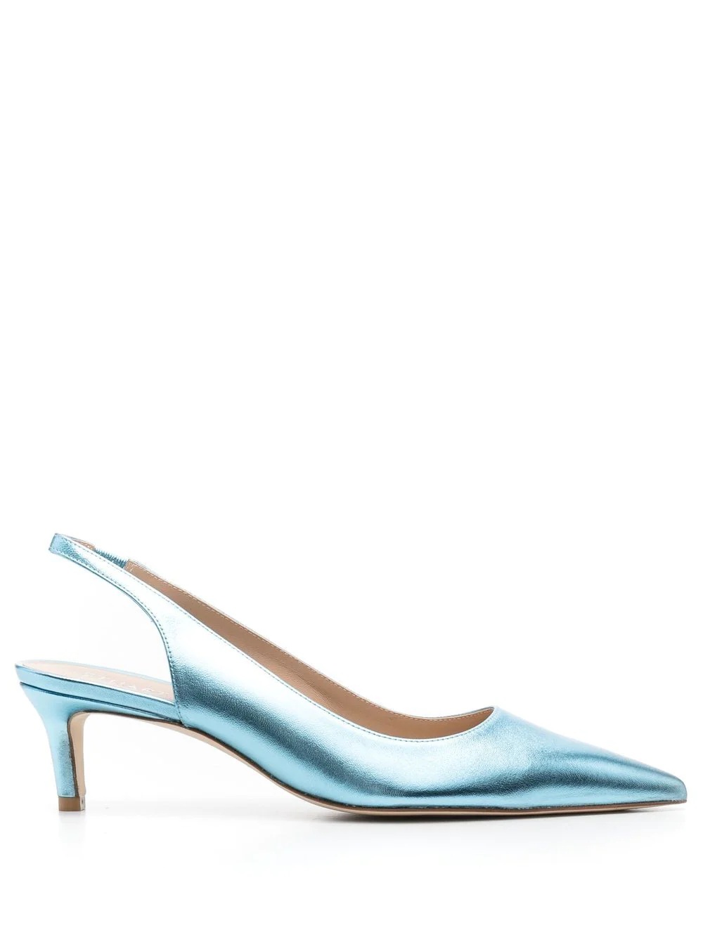 metallic-effect pointed pums metallic-effect pointed pums from STUART WEITZMAN featuring sky blue, calf leather, leather lining, metallic effect, pointed toe, slingback strap and low heel. Imported Composition Outer: Calf Leather 100% Lining: Calf Leather 100% Sole: Calf Leather 100% SIZE & FIT Measurement HEEL 2.55 in(6.5 cm)