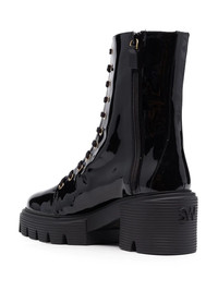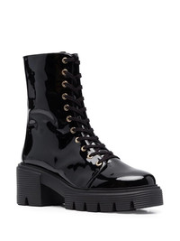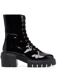 ridged lace-up boots ridged lace-up boots from STUART WEITZMAN featuring black, patent leather, front lace-up fastening, round toe, ridged rubber sole and low block heel. Imported Composition Lining: Calf Leather 100% Outer: Patent Leather 100% Sole: Rubber 100% SIZE & FIT Measurement HEEL 2.75 in(7 cm) HEIGHT 7.08 in(18 cm) Sole height 1.57 in(4 cm)