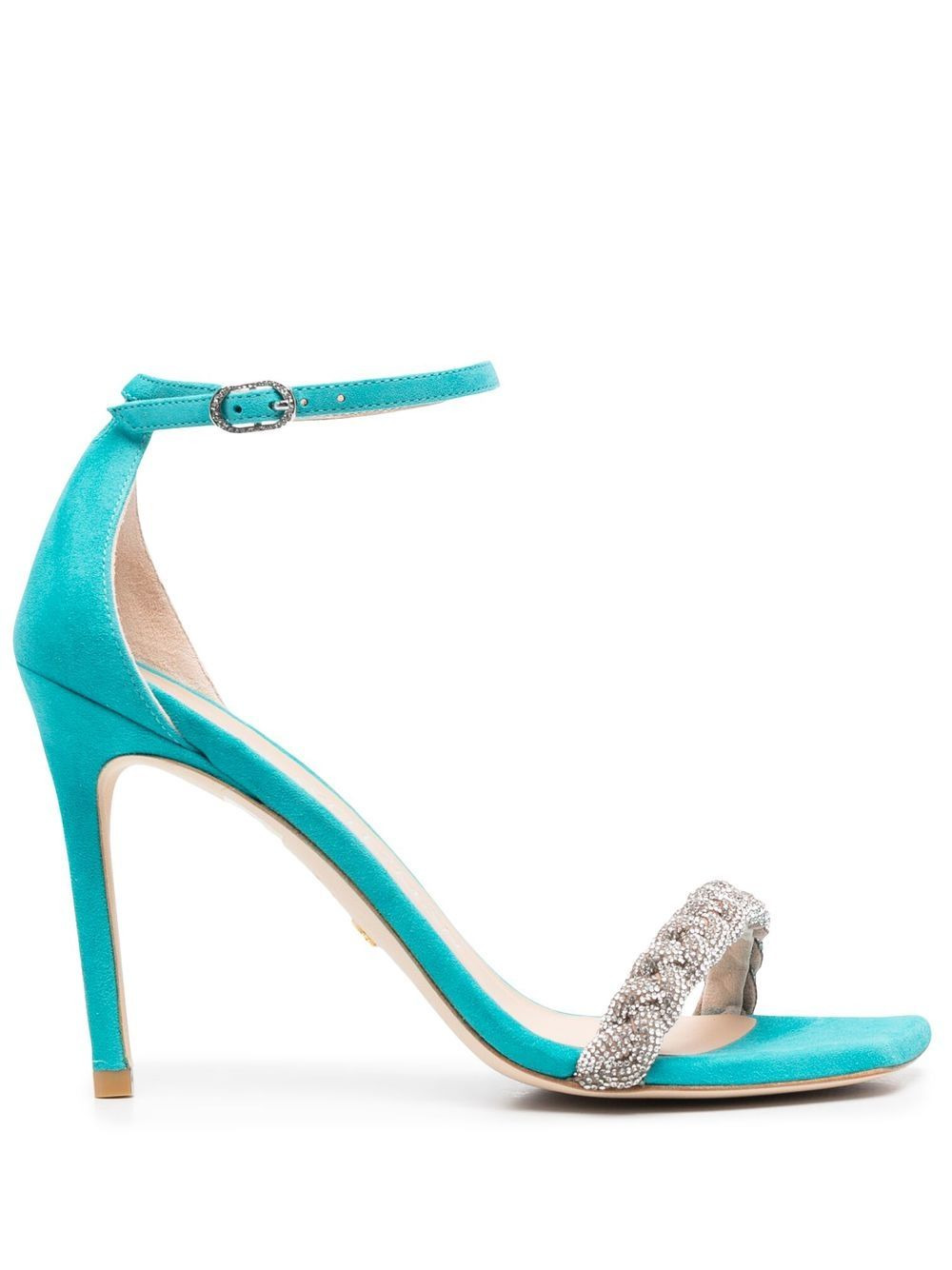 Sue 100mm braided-strap sandals cyan blue calf suede crystal embellishment braid detailing buckle-fastening ankle strap high heel Imported Composition Outer: Fabric 100%, Calf Suede 100% Lining: Calf Leather 100% Sole: Calf Suede 100% SIZE & FIT Measurement HEEL 3.93 in(10 cm)