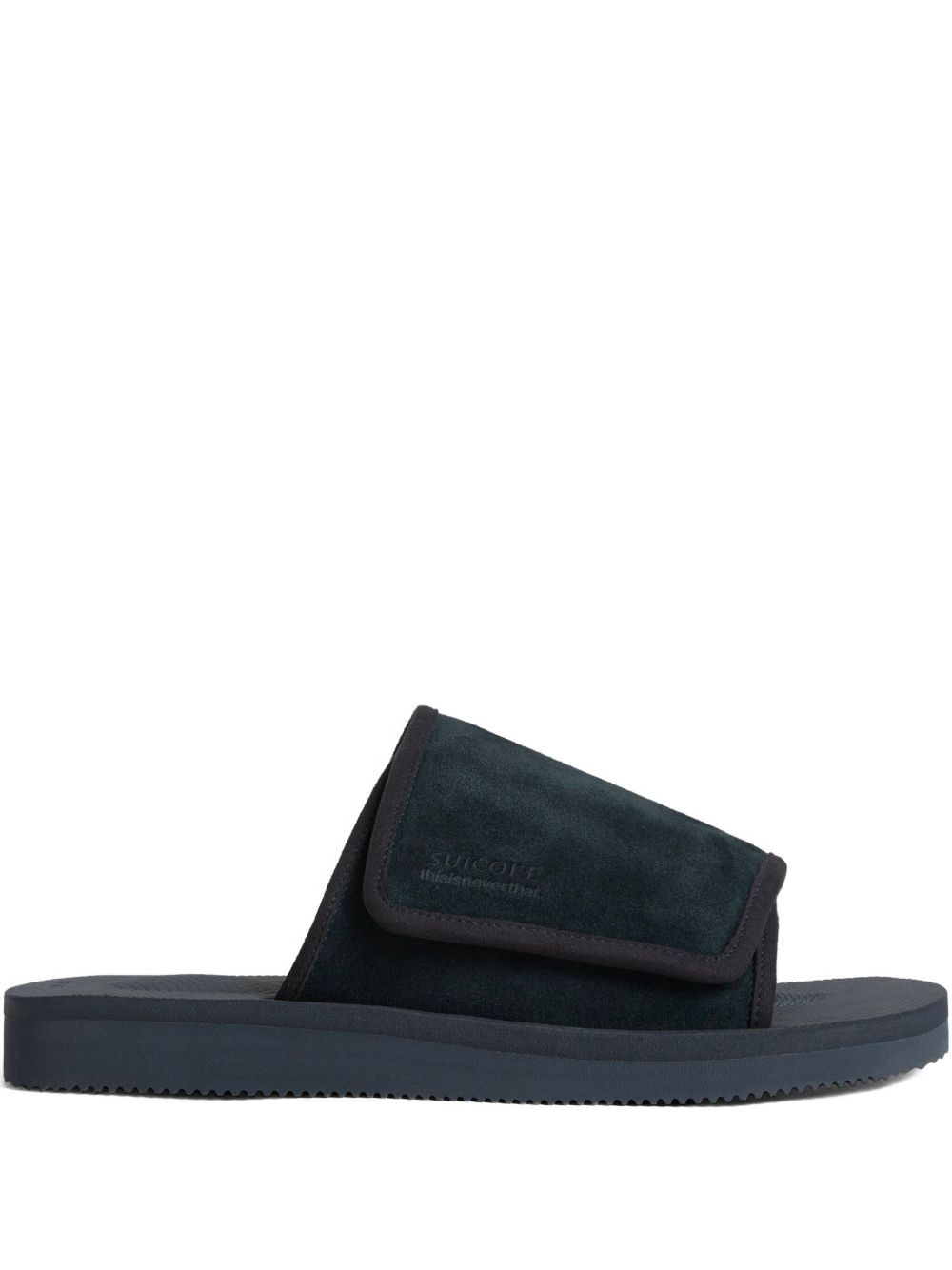 x Thisisneverthat suede strap slides Highlights - Navy blue - Suede strap - Textured sole - Open toe - Flat sole Imported Composition Sole: Rubber 100% Outer: Calf Suede 100% Lining: Fabric 100%