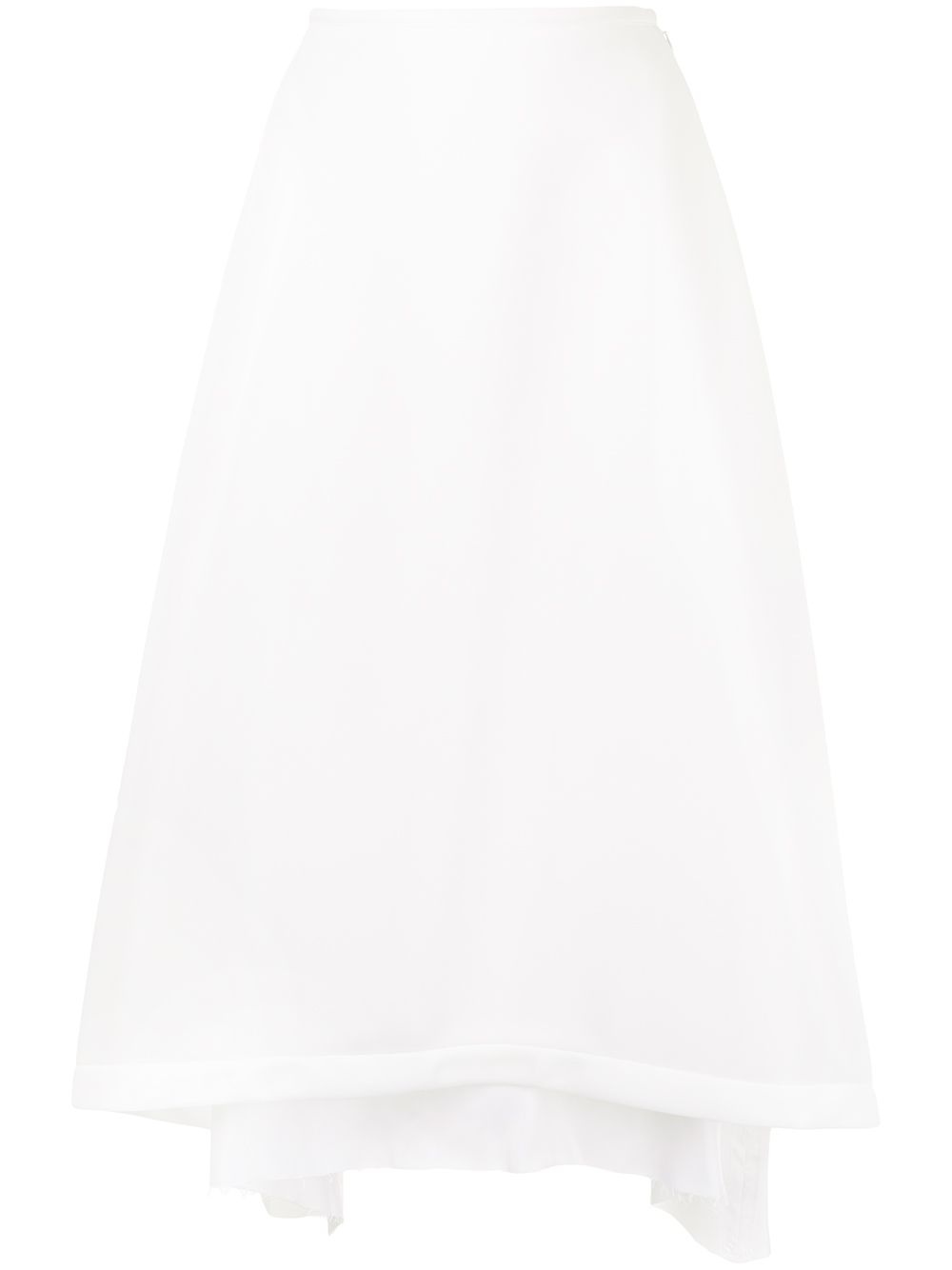 jersey knit flared skirt white concealed side zip fastening flared asymmetric hem raw edge Imported Composition Polyester 100% Lining: Cupro 100% SIZE & FIT Model measurements Height 5 ft 11 in(1.8 m) Bust/Chest 31.49 in(80 cm) Hips 35.03 in(89 cm) Waist 23.62 in(60 cm) FittingInformation This piece fits true to size. We recommend you get your regular size Designed for a loose fit with a close fit at the waist Made with a mid-weight non-stretch fabric Washing instructions Dry Clean Only
