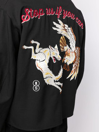 x Kozaburo embroidered shirt jacket Sulvam and Kozaburo's universes collide to create this black shirt jacket. Boasting a shirt collar, zip fastening and long sleeves, it is crafted from suiting wool in line with sulvam's tailoring-inspired silhouettes. Embroidered motifs embolden the jacket, with the designers' names embroidered at the front in the Japanese alphabet and statement graphic embroidery to the rear. Highlights - Black - Wool - Embroidered motif - Spread collar - Front zip fastening - Long sleeves - Buttoned cuffs - Two side slash pockets - Straight hem Imported Composition Body: Wool 100% Lining: Cupro 100% SIZE & FIT Model measurements Height 6 ft 2 in(1.87 m) Bust/Chest 33.46 in(85 cm) Hips 35.03 in(89 cm) Waist 26.57 in(67.5 cm) FittingInformation Designed to be unstructured, offering a loose fit throughout Made from a midweight non-stretch fabric This piece fits true to size – take your usual size