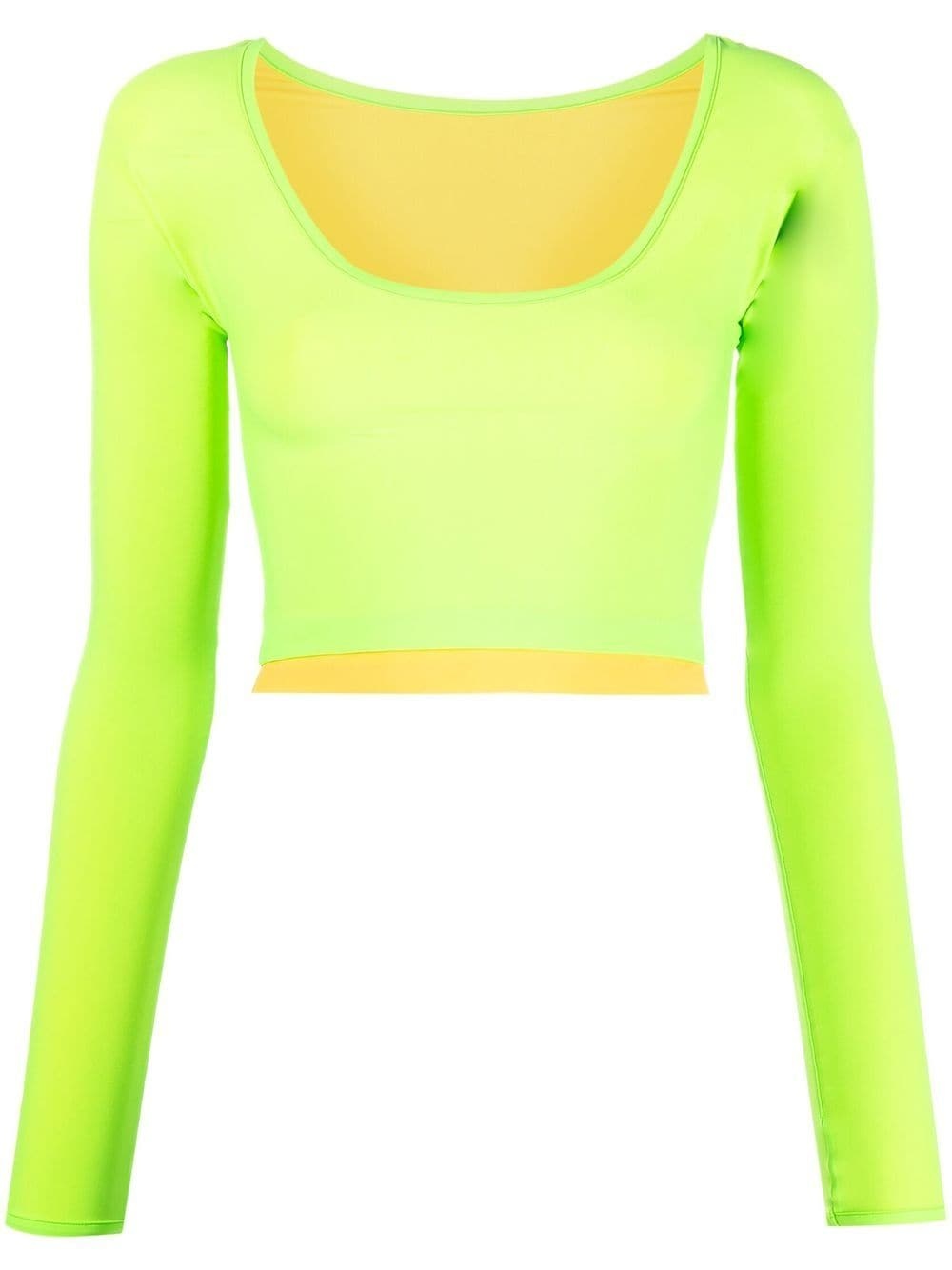 layered long-sleeved crop top fluorescent green/sunset orange stretch-jersey layered design scoop neck long sleeves cropped Imported Composition Polyamide 75%, Elastane 25% SIZE & FIT Model measurements Height 5 ft 10 in(1.77 m) Bust/Chest 35.03 in(89 cm) Hips 35.03 in(89 cm) Waist 23.62 in(60 cm) FittingInformation This piece fits true to size. We recommend you get your regular size Cut for a slim fit Made with a mid-weight stretch fabric Washing instructions Machine Wash