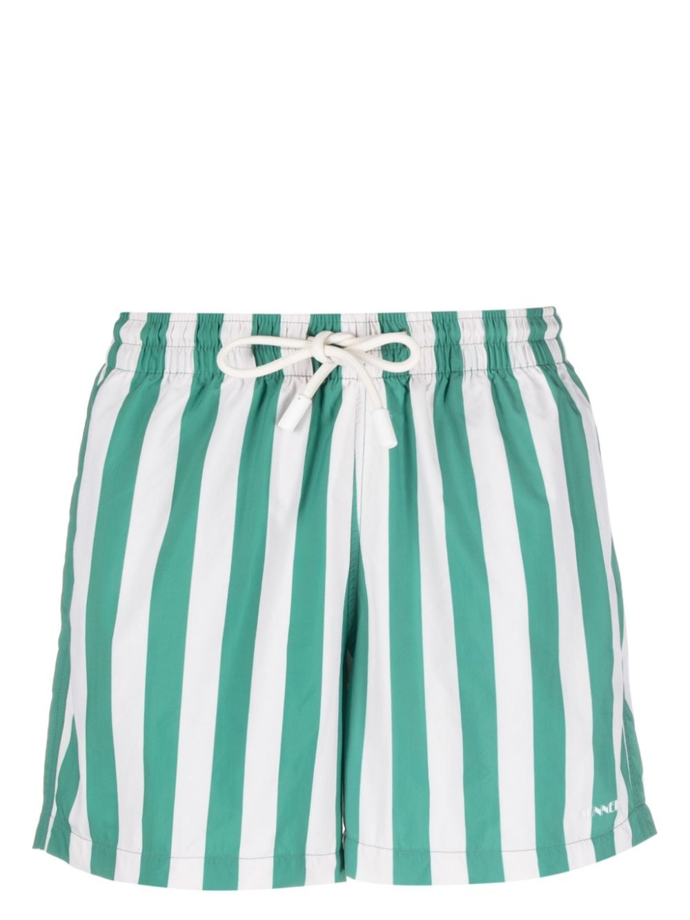 logo-print striped swim shorts Highlights - White/green - Vertical stripe pattern - Logo print to the side - Elasticated drawstring waistband - Two side inset pockets - Straight hem - Be mindful to try on swimwear over your own garments. Imported Composition Lining: Polyester 100% Outer: Polyamide 100%