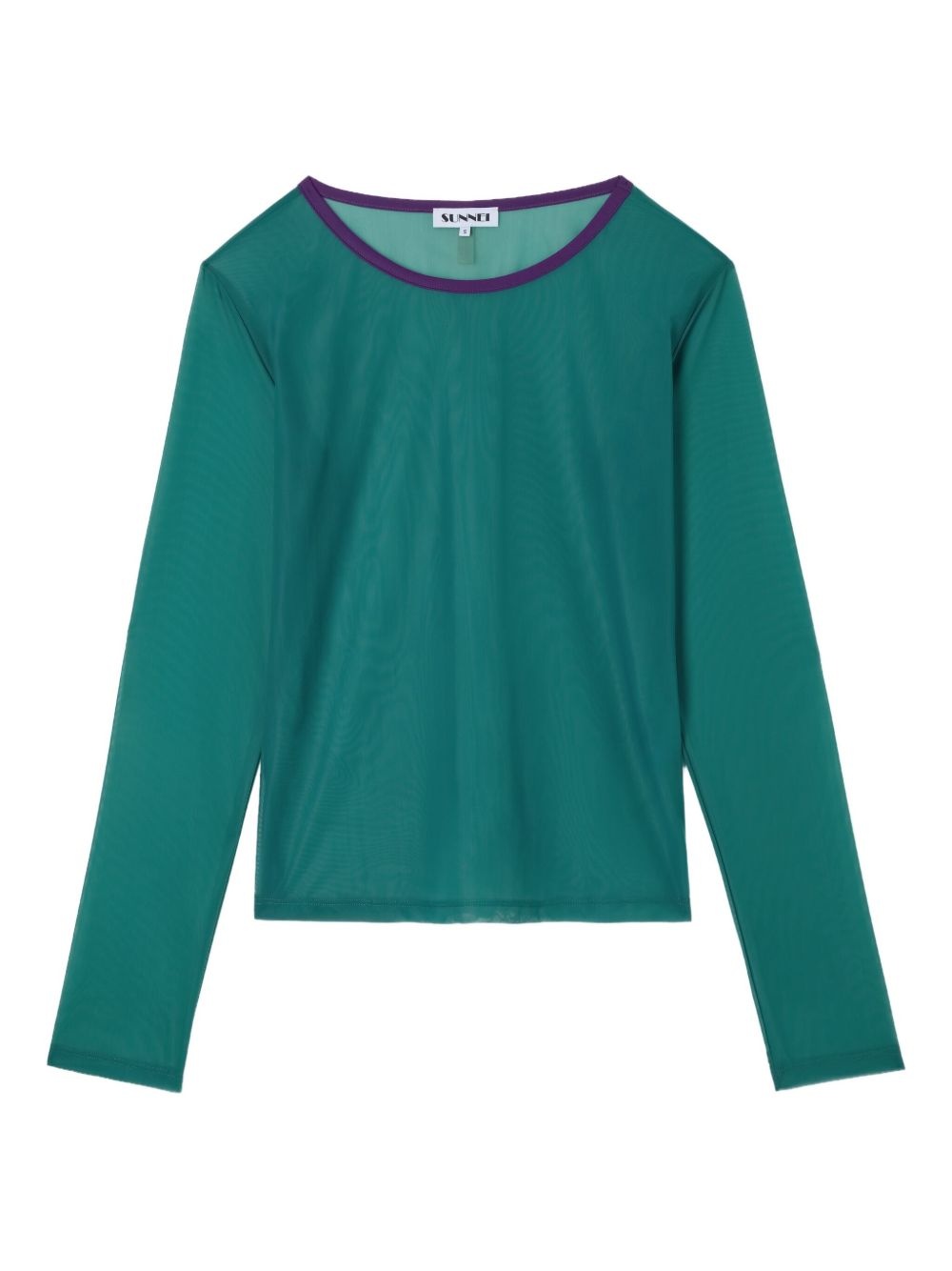 mesh long-sleeve top Highlights - Teal green - Contrasting neckline - Sheer design - Long sleeves - Straight hem Imported Composition Polyamide 67%, Elastane 33% Washing instructions Read Manufacturer Guidelines