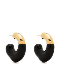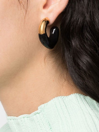 Rubberized Small Earrings black/ gold logo print to the side two-tone design medium hoop design These earrings come as a pair. Made in Italy SIZE & FIT Model measurements Height 5 ft 10 in(1.79 m) Bust/Chest 33.07 in(84 cm) Hips 35.82 in(91 cm) Waist 24.01 in(61 cm) Measurement HEIGHT 1.25 in(3.2 cm) Weight (single earring) 8 g(8 g) WIDTH 0.39 in(1 cm)