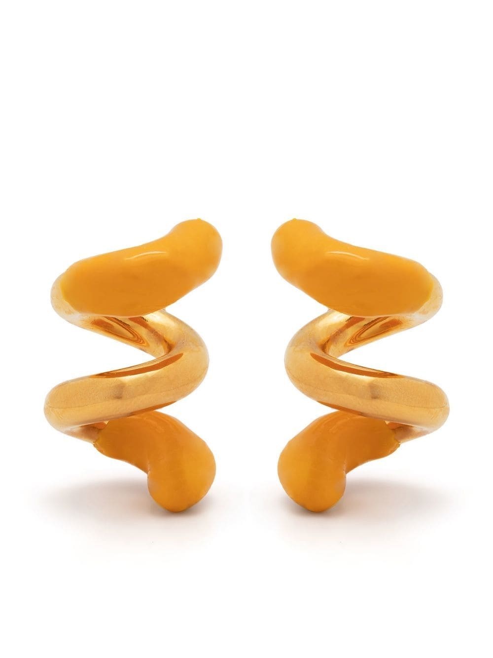 small rubberized curly earrings carrot orange/gold medium hoop design two-tone design These earrings come as a pair. Made in Italy SIZE & FIT Model measurements Height 5 ft 10 in(1.78 m) Bust/Chest 33.07 in(84 cm) Hips 36.61 in(93 cm) Waist 24.8 in(63 cm) Measurement HEIGHT 1.25 in(3.2 cm) Weight (single earring) 12 g(12 g) WIDTH 0.78 in(2 cm)