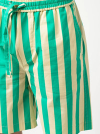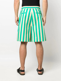 striped bermuda shorts beige/green cotton vertical stripe pattern elasticated drawstring waistband two side slash pockets two rear welt pockets straight leg Made in Italy Composition Outer: Cotton 100% Lining: Polyester 65%, Cotton 35% SIZE & FIT Model measurements Height 6 ft 3 in(1.9 m) Bust/Chest 38.18 in(97 cm) Hips 37.79 in(96 cm) Waist 32.67 in(83 cm) FittingInformation This piece fits true to size. We recommend you get your regular size Designed for a slim fit at the waist and loose over the leg Made with a mid-weight non-stretch fabric Washing instructions Hand Wash