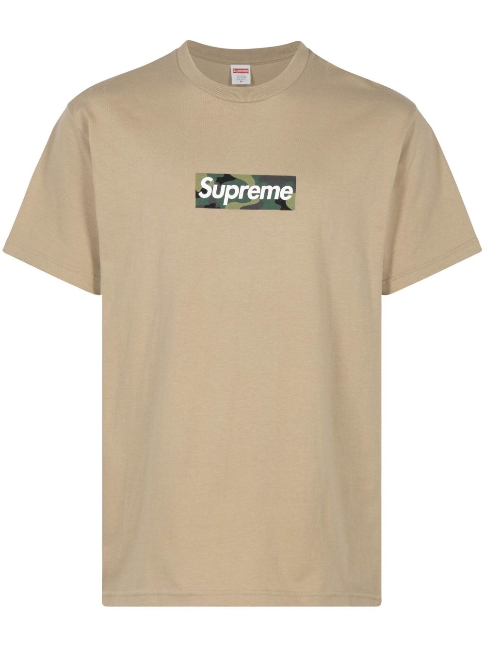 box logo cotton T-shirt Supreme's box logo is an iconic symbol in the world of streetwear. Designed in 1994 to coincide with the shop's opening in New York City, it features the brand's name in bold white lettering inside a rectangular red box. Throughout the years, it has been reinterpreted through different lenses, as seen in this beige T-shirt: cut from cotton, it is adorned with a camouflage version of the minimalist emblem. Highlights - Beige - Cotton - Jersey texture - Camouflage print - Signature box logo - Crew neck - Drop shoulder - Short sleeves - Straight hem - When buying this unisex item, keep in mind that it is graded in standard men's sizing. Imported Composition Cotton 100%