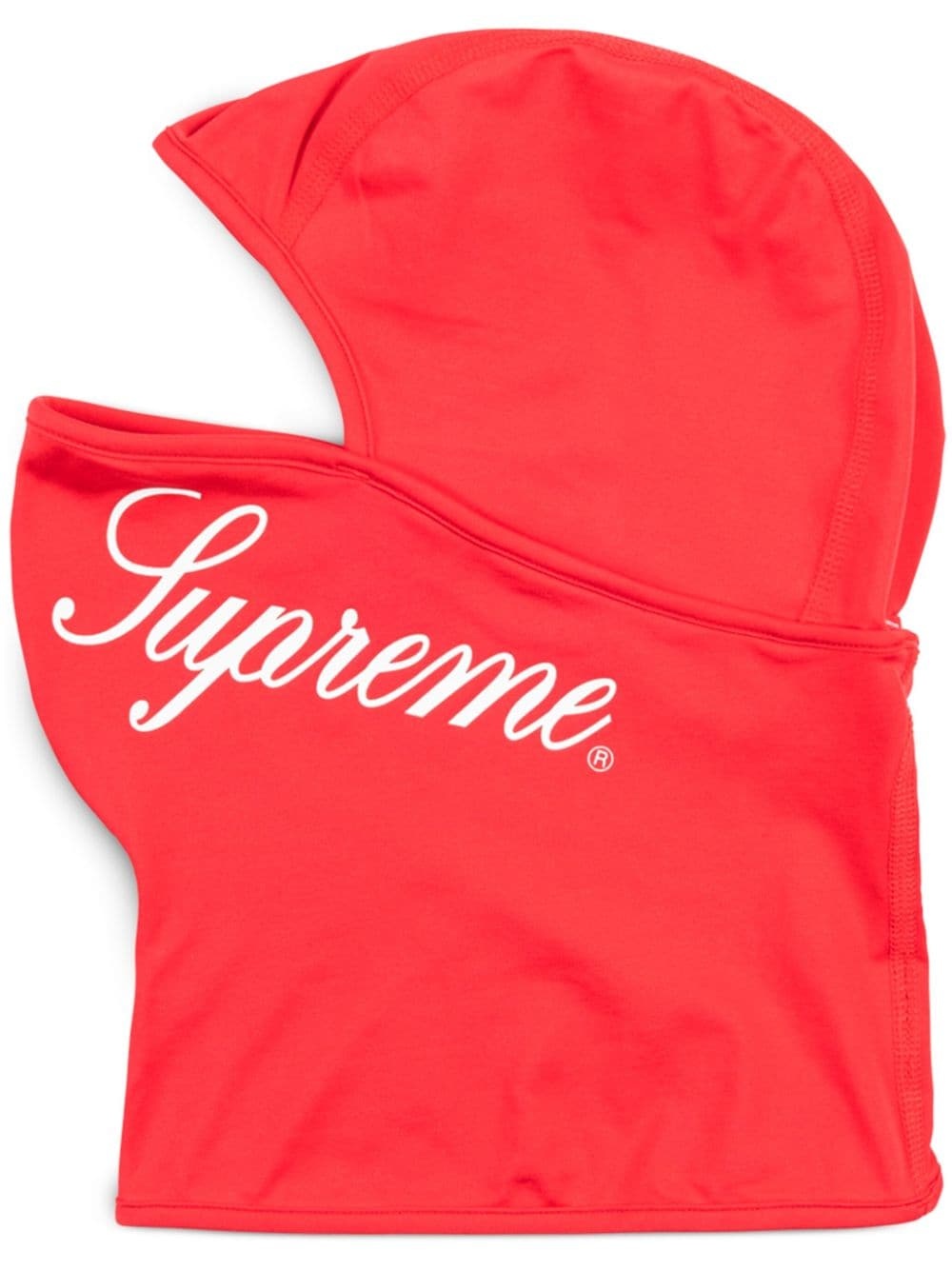 Script Logo-print balaclava Attuned to streetwear trends, Supreme introduces this scarlet balaclava. Cut from monochrome lightweight fabric, it boasts a sleek, classic mask design covering the face and neck. It is emblazoned with a script version of the brand's logo to the side, rendering it unmistakable. Highlights - Scarlet - Logo print to the side - Face opening - Pull-on style Imported Composition Polyester 100% Washing instructions Read Manufacturer Guidelines