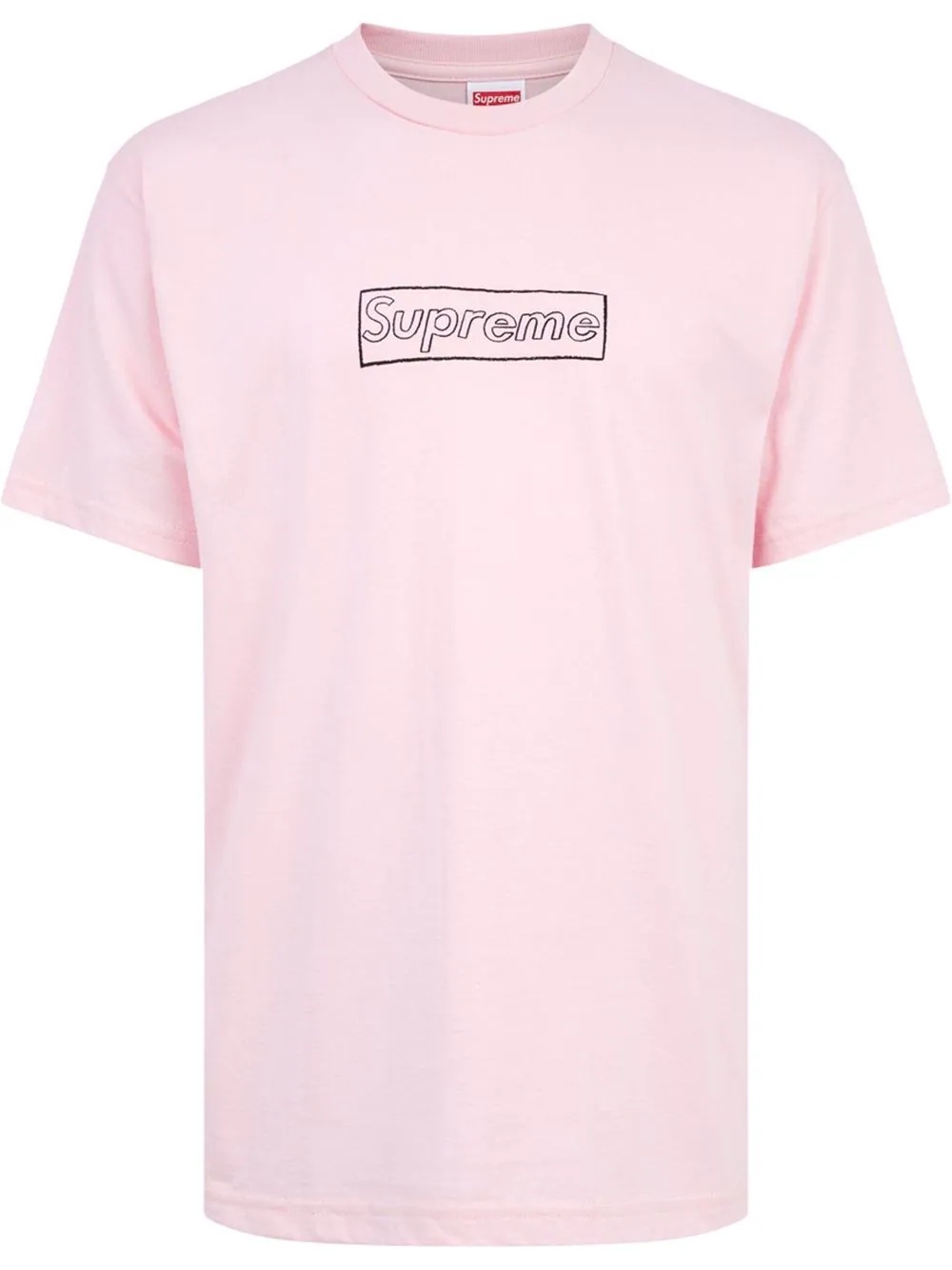 x KAWS Chalk Logo crew neck T-shirt The Supreme x KAWS collaboration is back for the autumn-winter 2021 collection. Reminiscent of the iconic box logo, this pink cotton design is anchored with a white chalk outline logo which has so far been deemed the most popular item in the drop of over 250 pieces. Highlights - Pink - Cotton - Signature box logo - Round neck - Short sleeves - Straight hem - When buying this unisex item, keep in mind that it is graded in standard men's sizing. Made in United States Composition Cotton 100% Washing instructions Machine Wash