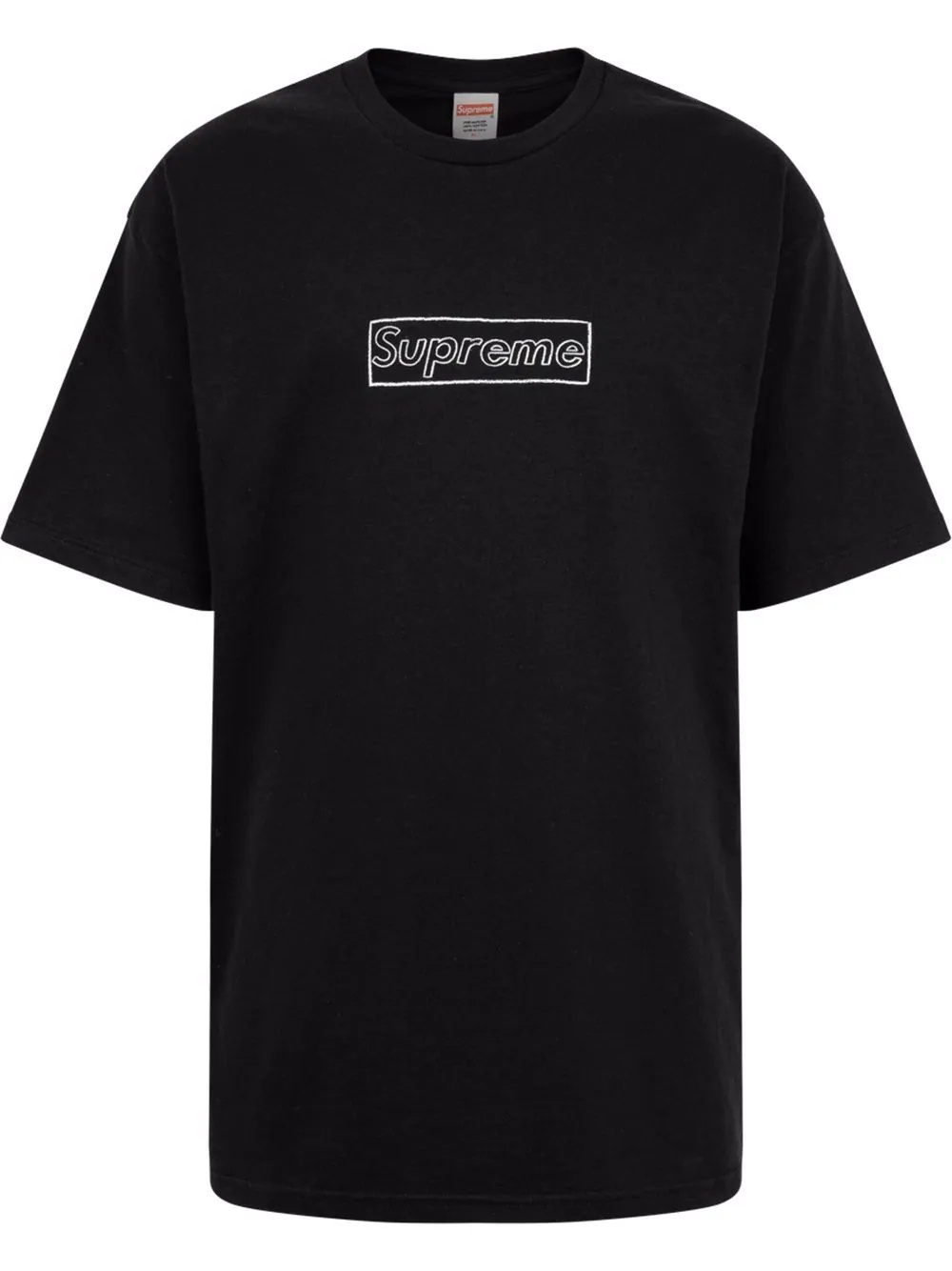 x Kaws Chalk Logo T-shirt The Supreme x KAWS collaboration is back for the autumn-winter 2021 collection. Reminiscent of the iconic box logo, this black cotton design is anchored with a white chalk outline logo which has so far been deemed the most popular item in the drop of over 250 pieces. Highlights - Black - Cotton - Signature box logo - Round neck - Short sleeves - Straight hem - When buying this unisex item, keep in mind that it is graded in standard men's sizing. Made in United States Composition Cotton 100% Washing instructions Machine Wash