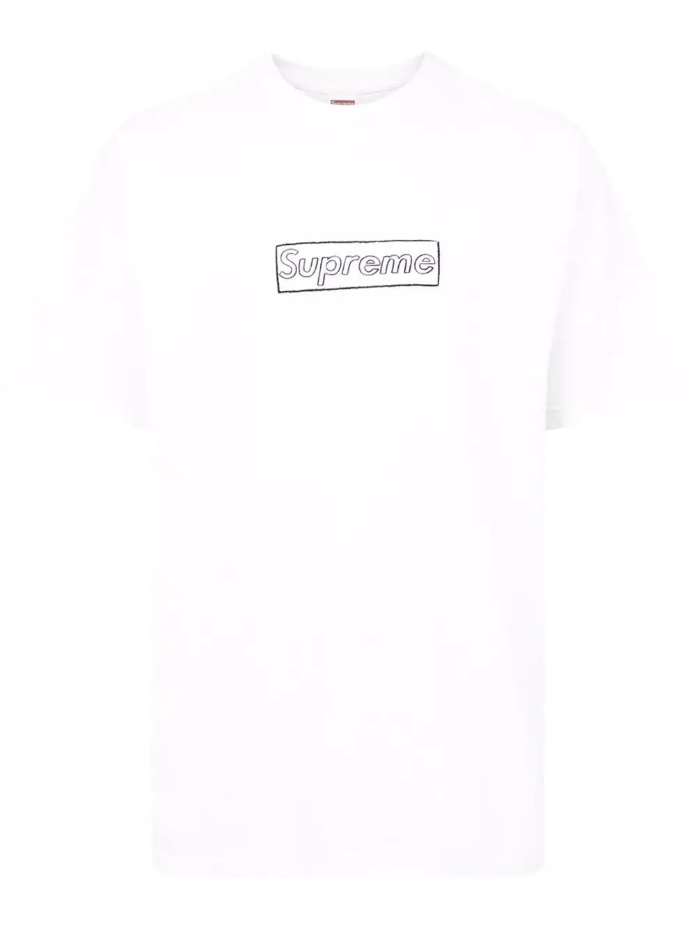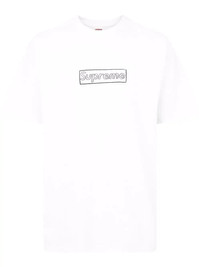 x Kaws Chalk Logo T-shirt The Supreme x KAWS collaboration is back for the autumn-winter 2021 collection. Reminiscent of the iconic box logo, this white cotton design is anchored with a white chalk outline logo which has so far been deemed the most popular item in the drop of over 250 pieces. Highlights - White - Cotton - Signature box logo - Round neck - Short sleeves - Straight hem - When buying this unisex item, keep in mind that it is graded in standard men's sizing. Made in United States Composition Cotton 100% Washing instructions Machine Wash