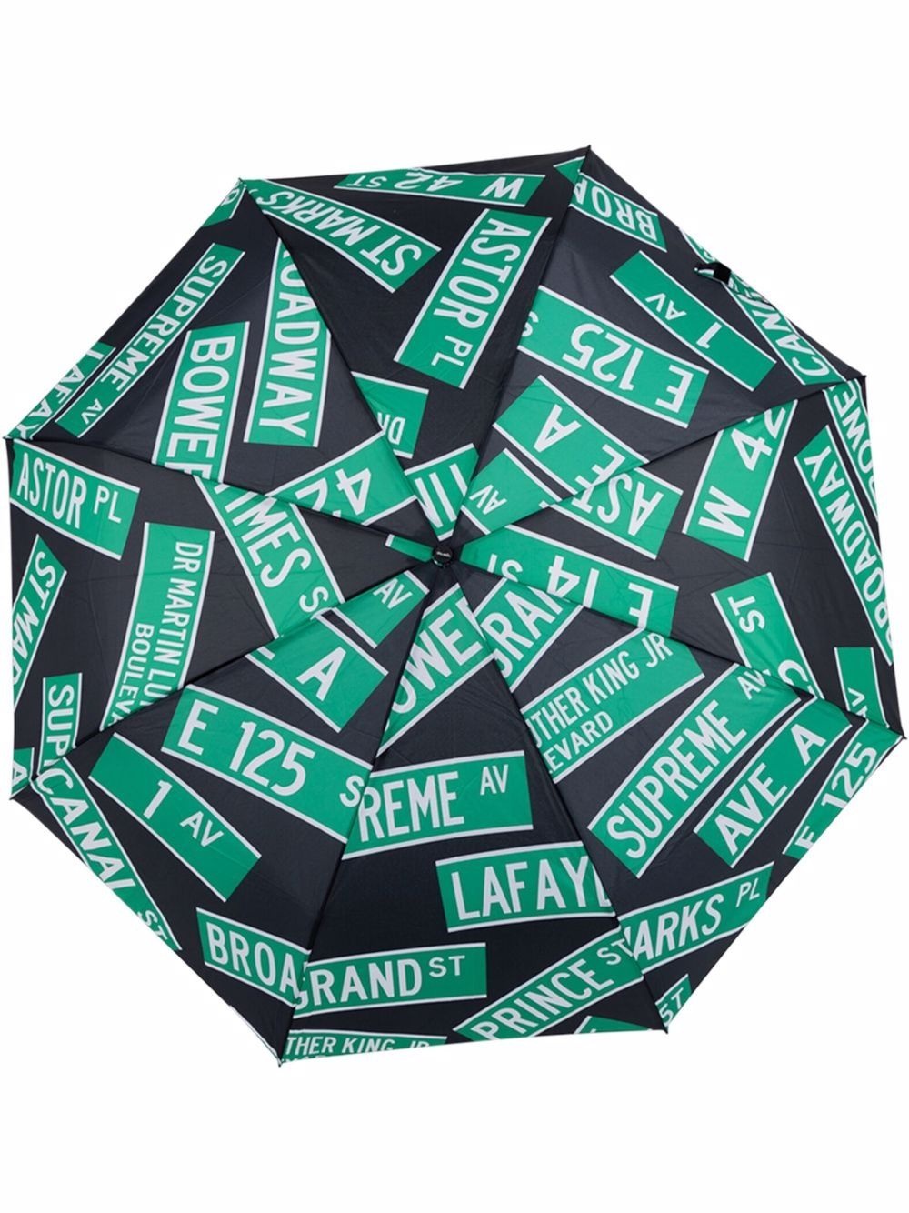 x Shedrain Street Signs umbrella Supreme has teamed up with ShedRain for the release of a new umbrella. This waterproof accessory features multiple street signs in green colour and is finished with a signature box logo patch on the strap. Made in United States Composition Nylon 100%, Metal (Other) 100%