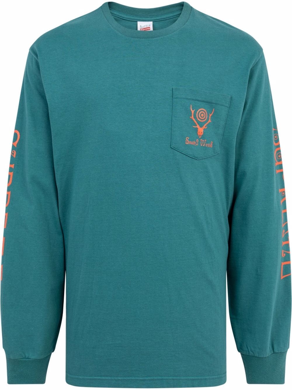 x South2 West8 long-sleeve T-shirt Bold logo graphics take the focus on this piece from Supreme x SOUTH2 WEST8. In a contrasting orange tone, they appear to the front, rear and sleeves, adding a signature street-style aesthetic. Made in United States Composition Cotton 100%