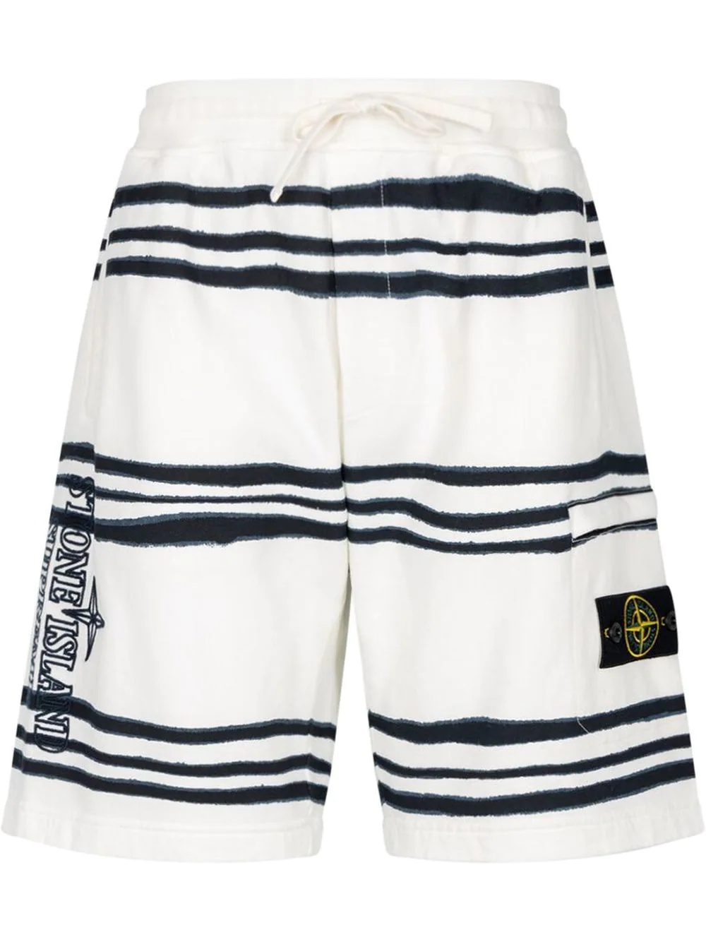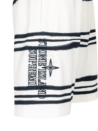 x Stone Island Warp striped shorts Supreme and Stone Island have teamed up to present the latest collection of clothing, all infused with rich designer codes. These shorts demonstrate both labels' affinity, thanks to the Compass patch and embroidered logo on the leg. Highlights - Black/white - Cotton - Signature compass motif - Embroidered logo to the side - Horizontal stripe pattern - Elasticated drawstring waistband - Slip pockets to the sides - When buying this unisex item, keep in mind that it is graded in standard men's sizing. Imported Composition Cotton 100%