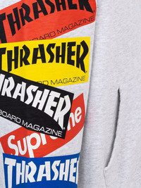 Thrasher multi logo zip-up hoodie Supreme and Thrasher have teamed up once again for a new design full of style and comfort. This zip-up hoodie is crafted from soft cotton and stands out thanks to the multiple and colourful logos printed on the sleeves. Highlights - Grey - Cotton - Logo print at the sleeve - Drawstring hood - Front pouch pocket - Front zip fastening - Long sleeves - Straight hem - When buying this unisex item, keep in mind that it is graded in standard men's sizing Made In United States Composition Cotton 100%