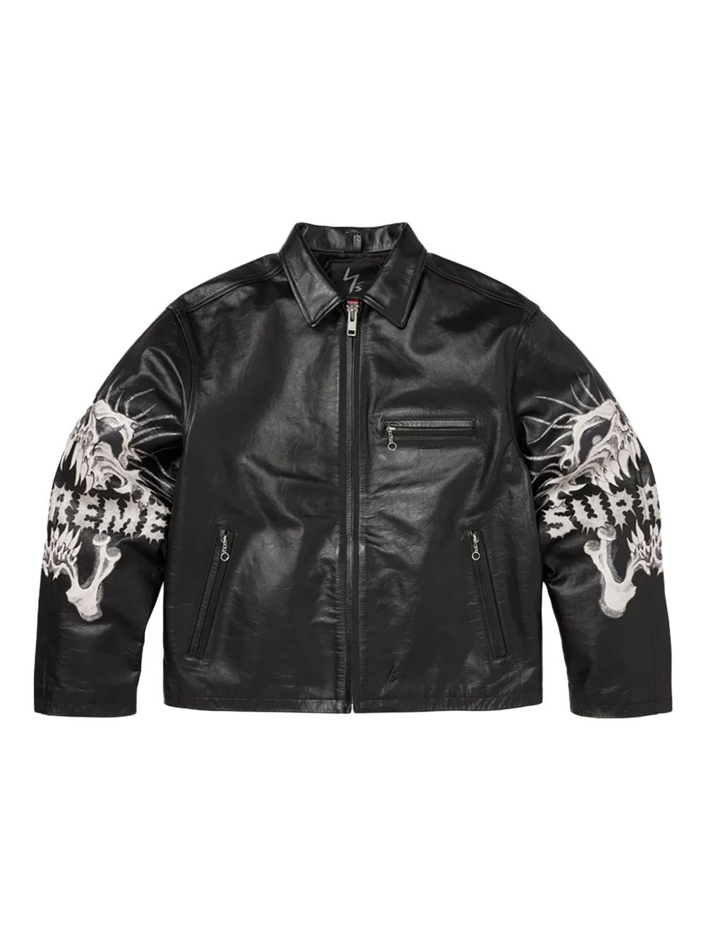 x Yohji Yamamoto leather jacket Highlights - Black - Skull print - Front zip fastening - Pointed collar - Long sleeves - Zip-fastening pockets Imported Composition Leather 100% Washing instructions Read Manufacturer Guidelines