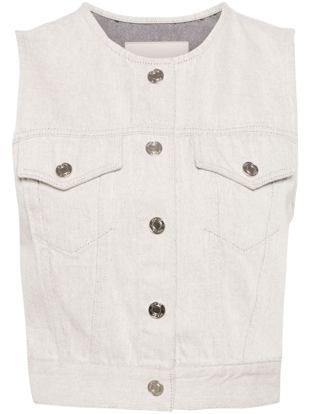 collarless denim vest Highlights - Light grey - Cotton - Denim - Logo-engraved buttons - Collarless - Round neck - Front press-stud fastening - Sleeveless - Two chest flap pockets - Straight hem Imported Composition Cotton 100%