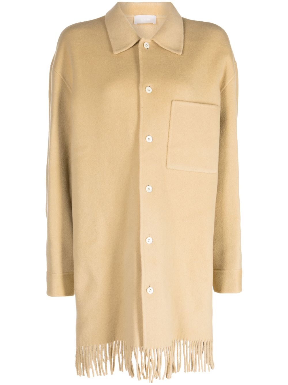fringed-hem single-breasted coat Highlights - Beige - Wool blend - Classic collar - Front button fastening - Chest patch pocket - Long sleeves - Buttoned cuffs - Fringed edge Imported Composition Wool 86%, Nylon 14%