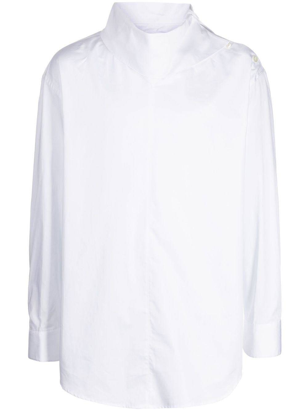 oversized-pointed collar cotton shirt Highlights - Optical white - Cotton - Oversized pointed collar - Button fastening at the shoulder - Long sleeves - Buttoned-cuff sleeves - Curved hem Imported Composition Cotton 100% SIZE & FIT Model measurements Height 6 ft 2 in(1.87 m) Bust/Chest 34.25 in(87 cm) Hips 36.22 in(92 cm) Waist 29.52 in(75 cm) FittingInformation Designed for a boxy fit, intended for a loose fit throughout Made from a midweight non-stretch fabric This piece fits true to size – take your usual size Washing instructions Dry Clean Only