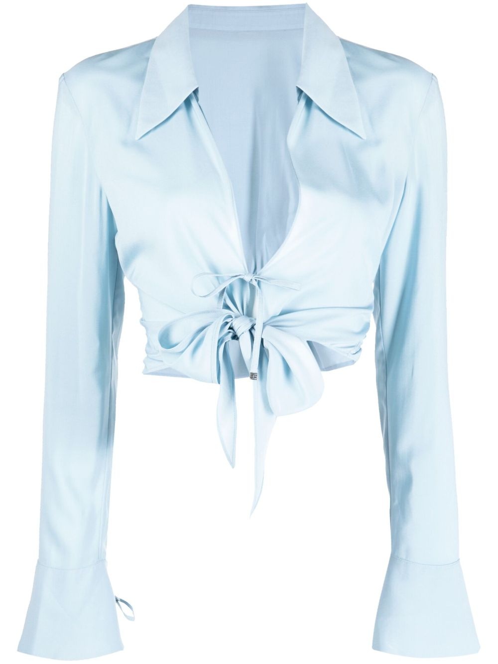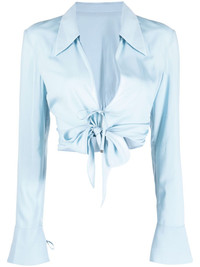 tie-fastening cropped blouse Highlights - Light blue - Spread collar - Front tie fastening - Smocked waist - Long sleeves - Tied cuffs - Cropped Imported Composition Body: Polyester 54%, Rayon 46% SIZE & FIT Model measurements Height 5 ft 11 in(1.8 m) Bust/Chest 28.34 in(72 cm) Hips 35.43 in(90 cm) Waist 23.62 in(60 cm) FittingInformation Designed for a slim fit that sits just away from the body offering a close yet comfortable fit The tie fastening gives an adaptable and personalised fit Made from a lightweight non-stretch fabric This piece fits true to size – take your usual size Washing instructions Dry Clean Only