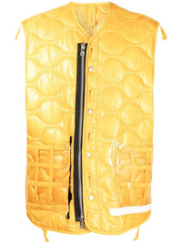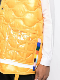 quilted transparent pocket gilet yellow quilted finish transparent pockets front button and zip fastening V-neck sleeveless Imported Composition Nylon 100% SIZE & FIT Model measurements Height 6 ft 3 in(1.9 m) Bust/Chest 35.03 in(89 cm) Hips 36.61 in(93 cm) Waist 29.13 in(74 cm) Measurement CHEST 47.99 in(121.9 cm) WAIST 50 in(127 cm) Shoulder Width 17.99 in(45.7 cm) FittingInformation This piece fits true to size. We recommend you get your regular size Cut for an oversized fit. If you like a tighter fit, get the next size down Made with a lightweight non-stretch fabric Washing instructions Hand Wash
