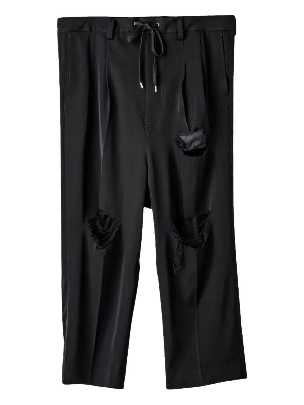 two-tuck "Black" trousers Highlights - Black - Distressed effect - Elasticated drawstring waistband - Belt loops - Pleat detailing - Two side inset pockets Imported Composition Fabric 100% Washing instructions Read Manufacturer Guidelines