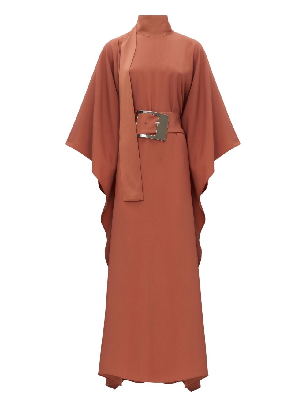 belted batwing maxi dress Highlights - Terracotta - Batwing sleeves - High neck - Self-tie belt Made in Italy Composition Acetate 78%, Viscose 22% Washing instructions Dry Clean Only