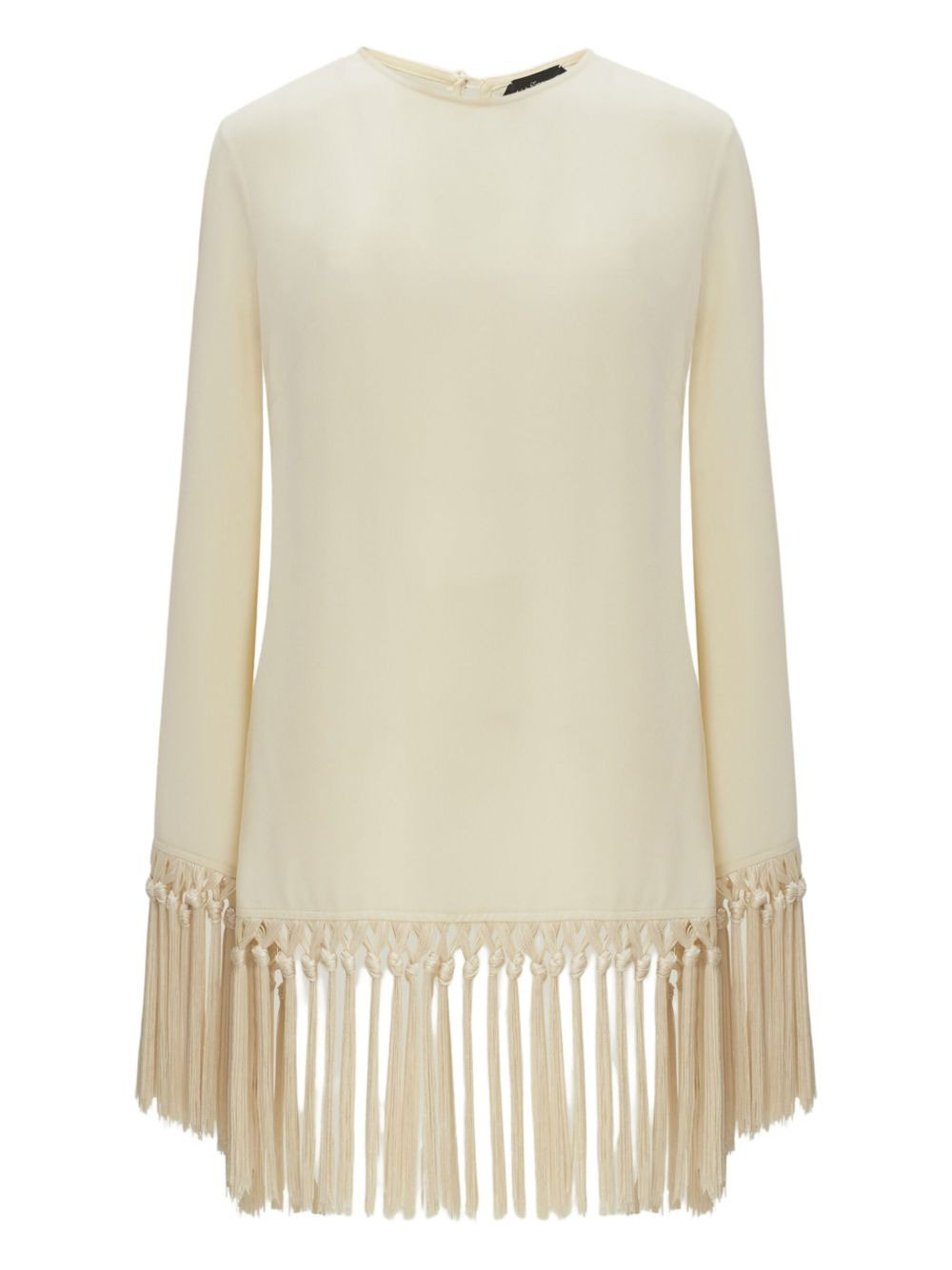 fringe-trimmed mini dress Highlights - Ivory - Long sleeves - Fringed trim - Round neck - Mini length Made in Italy Composition Acetate 78%, Viscose 22% Washing instructions Dry Clean Only