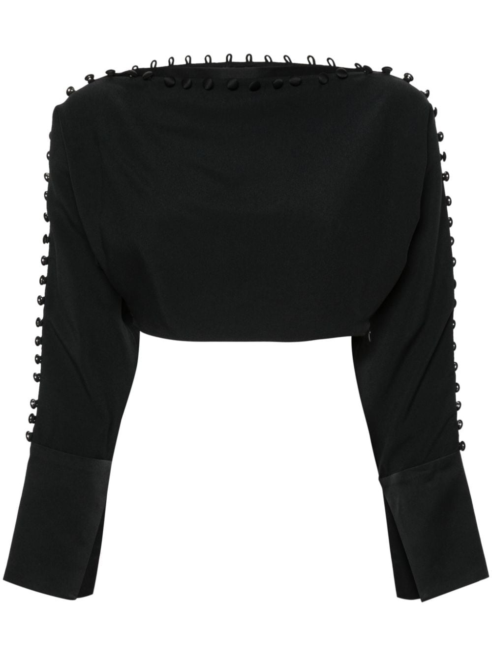 Mila blouse Highlights - Black - Cady texture - Concealed side zip fastening - Fabric-covered buttons - Slash neck - Long sleeves - Buttoned cuffs - Straight hem - Cropped Made in Italy Composition Acetate 78%, Viscose 22% SIZE & FIT Model measurements Height 5 ft 9 in(1.75 m) Bust/Chest 34.64 in(88 cm) Hips 36.61 in(93 cm) Waist 26.37 in(67 cm) FittingInformation Designed for a relaxed fit, this piece allows for comfort and movement when worn Cropped in length Made from a midweight non-stretch fabric