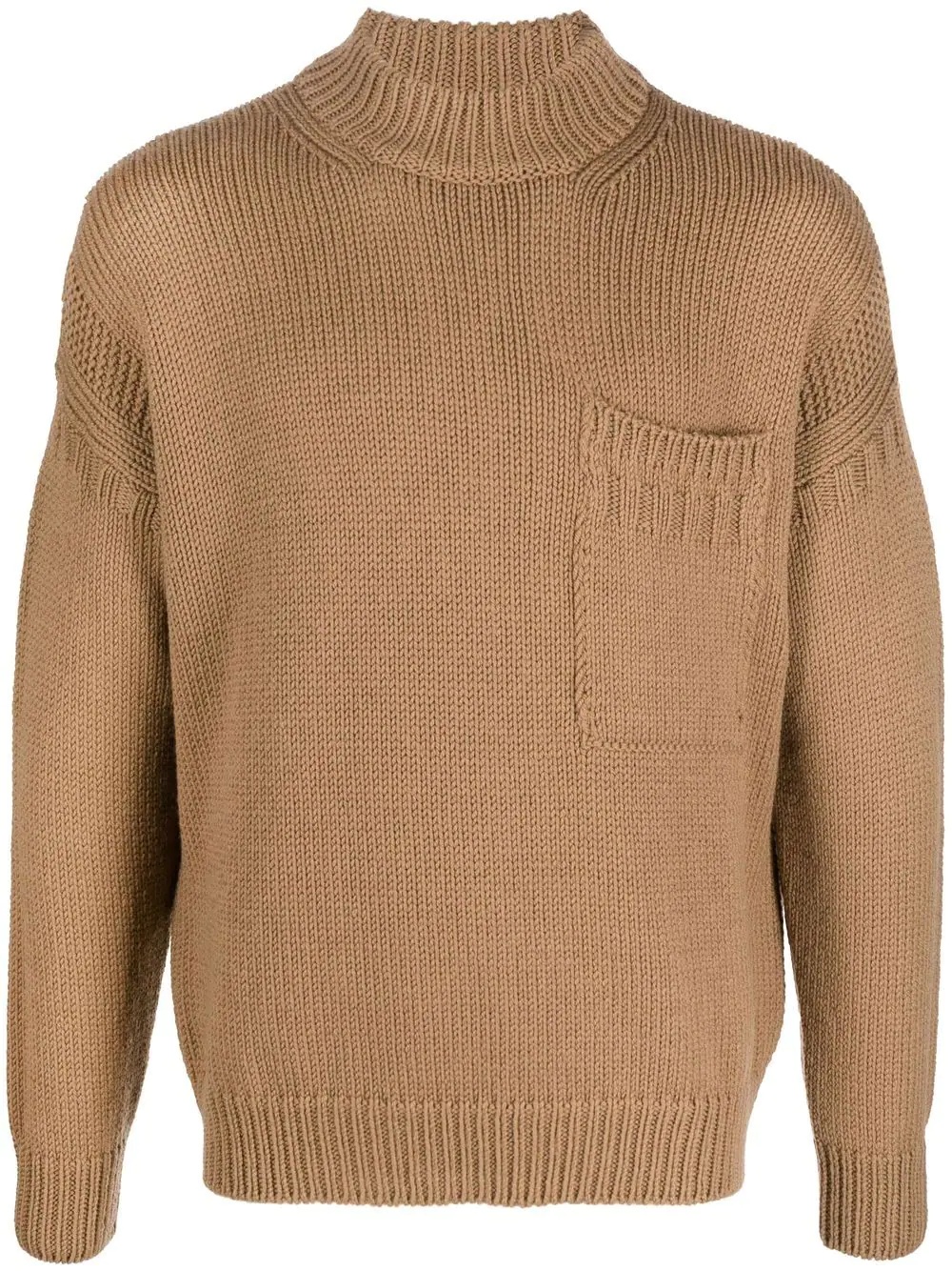 mock-neck knitted jumper sand beige wool knitted construction mock neck drop shoulder long sleeves chest patch pocket ribbed-knit edge Made in Italy Composition Wool 100% SIZE & FIT Model measurements Height 6 ft 2 in(1.87 m) Bust/Chest 35.03 in(89 cm) Hips 39.37 in(100 cm) Waist 29.13 in(74 cm) FittingInformation This piece fits true to size. We recommend you get your regular size Cut for a loose fit Made with a mid-weight fabric Washing instructions Hand Wash