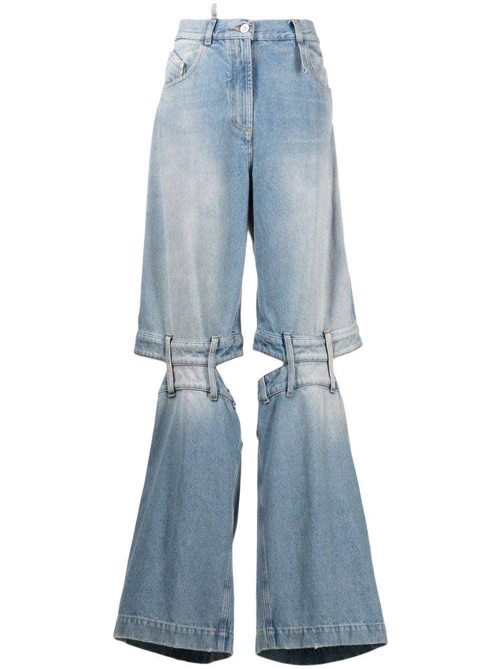 Ashton mid-rise wide-leg jeans The Attico’s Ashton jeans speak to the brand’s hybrid aesthetic. Crafted from cotton to a blue-washed denim, they're deconstructed into shorts and wide-leg cut-outs connected with belt loops at the knee. Highlights - Sky blue - Cotton - Denim - Contrast stitching - Cut-out detailing - Embroidered logo to the rear - Mid-rise - Belt loops - Front button and zip fastening - Wide leg - Classic five pockets - Straight hem - Long length Made in Italy Composition Lining: Polyester 65%, Cotton 35% Outer: Cotton 100% SIZE & FIT Model measurements Height 5 ft 9 in(1.76 m) Bust/Chest 33.07 in(84 cm) Hips 38.58 in(98 cm) Waist 24.8 in(63 cm) Measurement FRONT RISE 12.99 in(33 cm) INSIDE LEG 32.87 in(83.5 cm) HIPS 45.27 in(115 cm) WAIST 28.74 in(73 cm) Washing instructions Hand Wash
