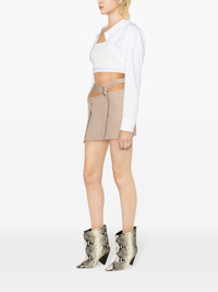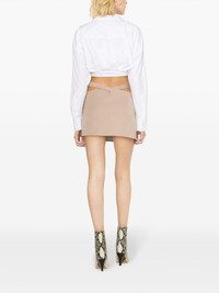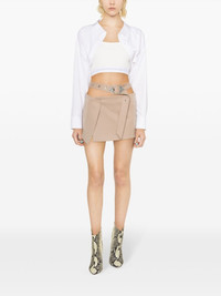 asymmetric belted miniskirt This mini skirt in beige hue is a perfect blend of formal and casual fashion. Made from premium quality virgin wool, it boasts a monochromatic design with a cross detail on the back, along with a belt and a metal buckle with the brand logo. Highlights - Taupe - Virgin wool - Gabardine weave - Asymmetric design - Metal eyelet detailing - Mid-rise - Off-centre front fastening - Adjustable waist buckle belt - Straight hem - Striped lining - Thigh-length Made in Italy Composition Outer: Virgin Wool 100% Lining: Acetate 53%, Viscose 47% SIZE & FIT Model measurements Height 5 ft 10 in(1.79 m) Bust/Chest 31.49 in(80 cm) Hips 35.03 in(89 cm) Waist 23.62 in(60 cm) Measurement HIPS 32 in(81.3 cm) LENGTH 10.98 in(27.9 cm) WAIST 29.01 in(73.7 cm) FittingInformation This mini-length skirt is intended to be worn low on the hips The belt offers adjustability for fitted preferences Made from a midweight non-stretch fabric This piece fits true to size – take your usual size Washing instructions Machine Wash