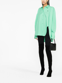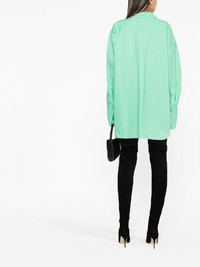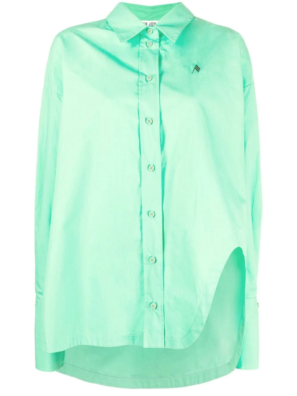 asymmetric cotton shirt The Attico shapes this long-sleeved cotton shirt around their angular initial. Designed in a mint green hue, the brand's logo is embroidered at the chest, whilst the asymmetric silhouette sees a cut-out detail curve the hem in the shape of their cherished 'A' initial. Made in Italy Composition Cotton 100% SIZE & FIT Measurement HIPS 64.56 in(164 cm) Washing instructions Machine Wash