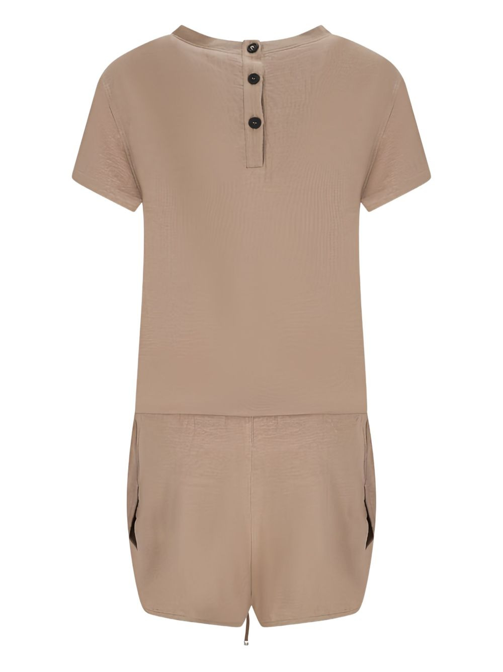 button-fastening drawstring jumpsuit Highlights - Beige - Short sleeves - Drawstring waist - Button fastening - Round neck - Embroidered logo Imported Composition Fabric 100% Washing instructions Read Manufacturer Guidelines