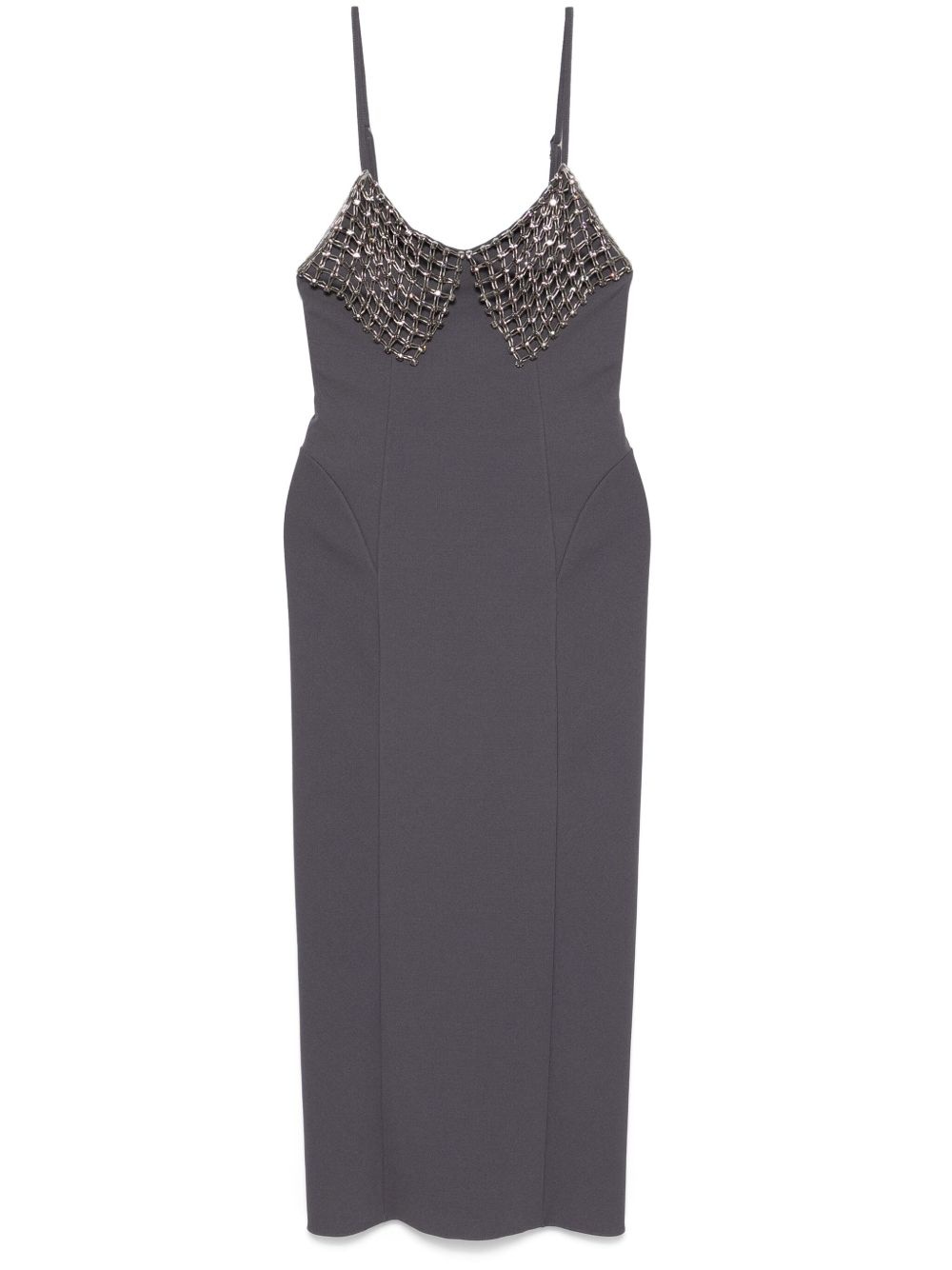 crystal-detail midi dress Highlights - Dark grey - Concealed rear zip fastening - Adjustable spaghetti straps - Bead embellishment - V-neck Made in Italy Composition Polyester 100% SIZE & FIT Model measurements Height 5 ft 11 in(1.8 m) Bust/Chest 31.49 in(80 cm) Hips 35.82 in(91 cm) Waist 24.8 in(63 cm) FittingInformation Designed for a slim fit that sits just away from the body offering a close yet comfortable fit The adjustable shoulder straps allow for a preferred fit when worn Made from a midweight non-stretch fabric, this piece offers minimal elasticity when worn