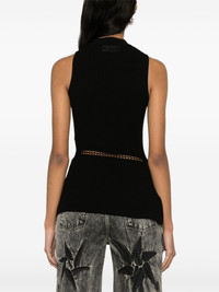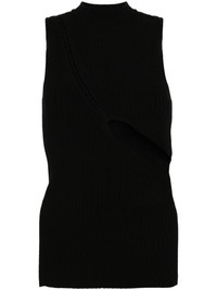 cut-out ribbed-knit tank top Sculptural cuts and architectural elements are at the heart of The Attico's style, and this black tank top is a testament to that. The finely ribbed silhouette is adorned with braided cut-outs, while sharp slits reveal a flash of skin. Highlights - Black - Ribbed knit - Cut-out detailing - Braid detailing - Logo patch to the rear - Mock neck - Sleeveless - Side slit - Straight hem - Unlined Made in Italy Composition Viscose 69%, Polyester 29%, Cotton 2% SIZE & FIT Model measurements Height 5 ft 11 in(1.8 m) Bust/Chest 32.67 in(83 cm) Hips 35.82 in(91 cm) Waist 24.8 in(63 cm) FittingInformation Designed for a close fit throughout Made with a midweight knit, this piece offers some stretch This piece fits true to size – take your usual size Measurement LENGTH 22 in(55.9 cm) WAIST 20 in(50.8 cm) BUST 20.98 in(53.3 cm)