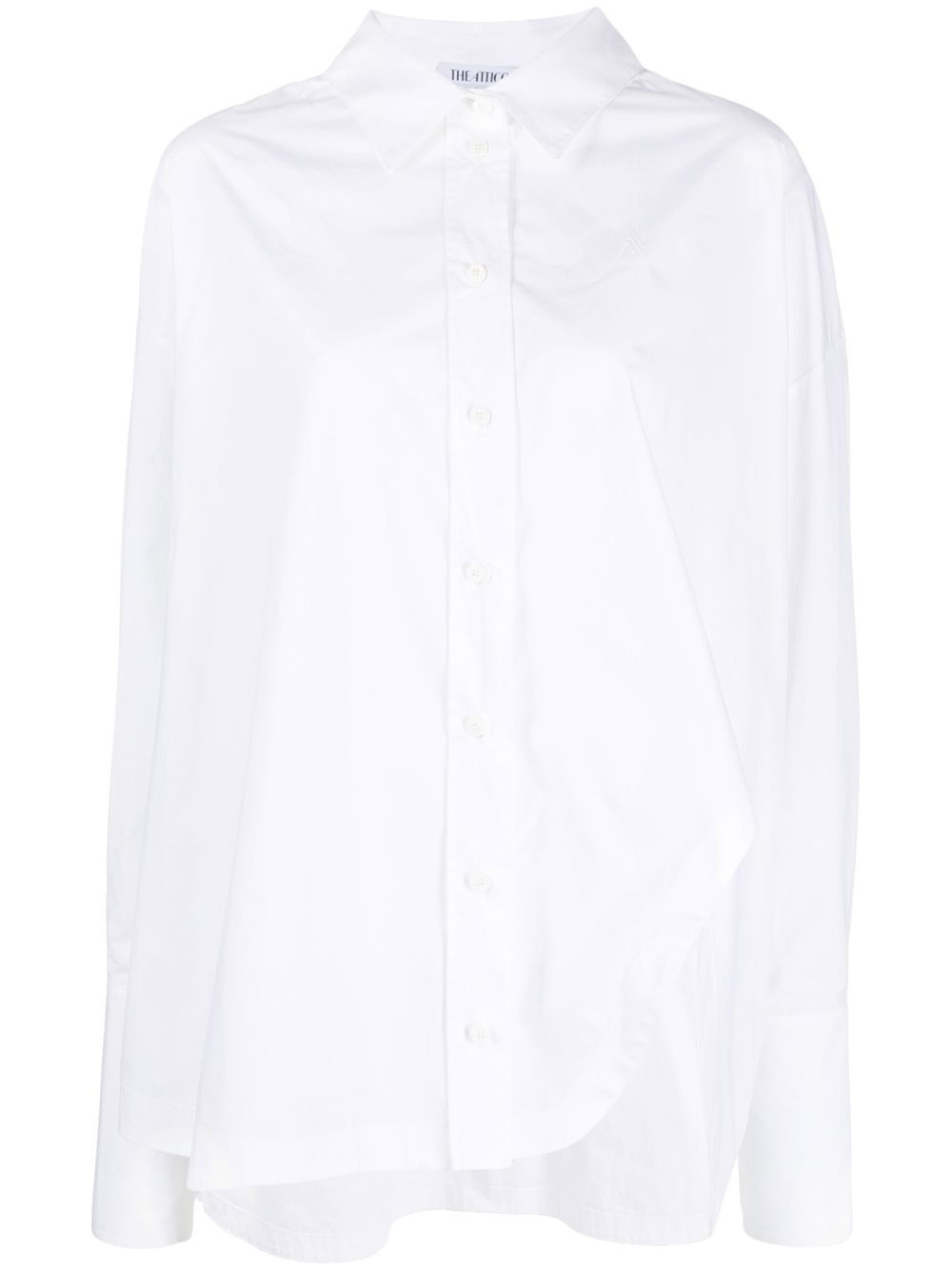 Diana asymmetric button-up shirt The Attico updates the classic button-up shirt. In a timeless white colourway, the piece has a distinctive asymmetric design and a slightly oversized cut. Made in Italy Composition Cotton 100% SIZE & FIT Model measurements Height 5 ft 11 in(1.8 m) Bust/Chest 31.49 in(80 cm) Hips 35.82 in(91 cm) Waist 24.8 in(63 cm) Measurement HIPS 63.77 in(162 cm) FittingInformation This piece fits true to size. We recommend you get your regular size Cut for a loose fit Made with a mid-weight non-stretch fabric Washing instructions Machine Wash