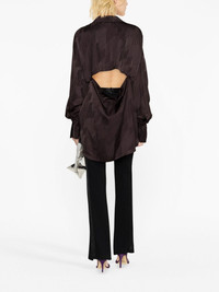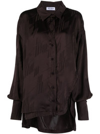 Diana cut-out asymmetric shirt An iconic style from The Attico, the Diana shirt is a showcase of the brand's innovative take on tailoring. Keeping its signature asymmetric hem, this chocolate brown iteration displays the brand's logo all over and is finished with a deep cut at the back. Highlights - Chocolate brown - All-over logo print - Classic collar - Front button fastening - Long sleeves - Buttoned cuffs - Asymmetric hem - Cut-out detailing Made in Italy Composition Viscose 100% SIZE & FIT Model measurements Height 5 ft 10 in(1.79 m) Bust/Chest 31.49 in(80 cm) Hips 35.03 in(89 cm) Waist 23.62 in(60 cm) FittingInformation Designed for an oversized fit, offering additional room throughout Made from a midweight non-stretch fabric This piece fits true to size – take your usual size Washing instructions Dry Clean Only