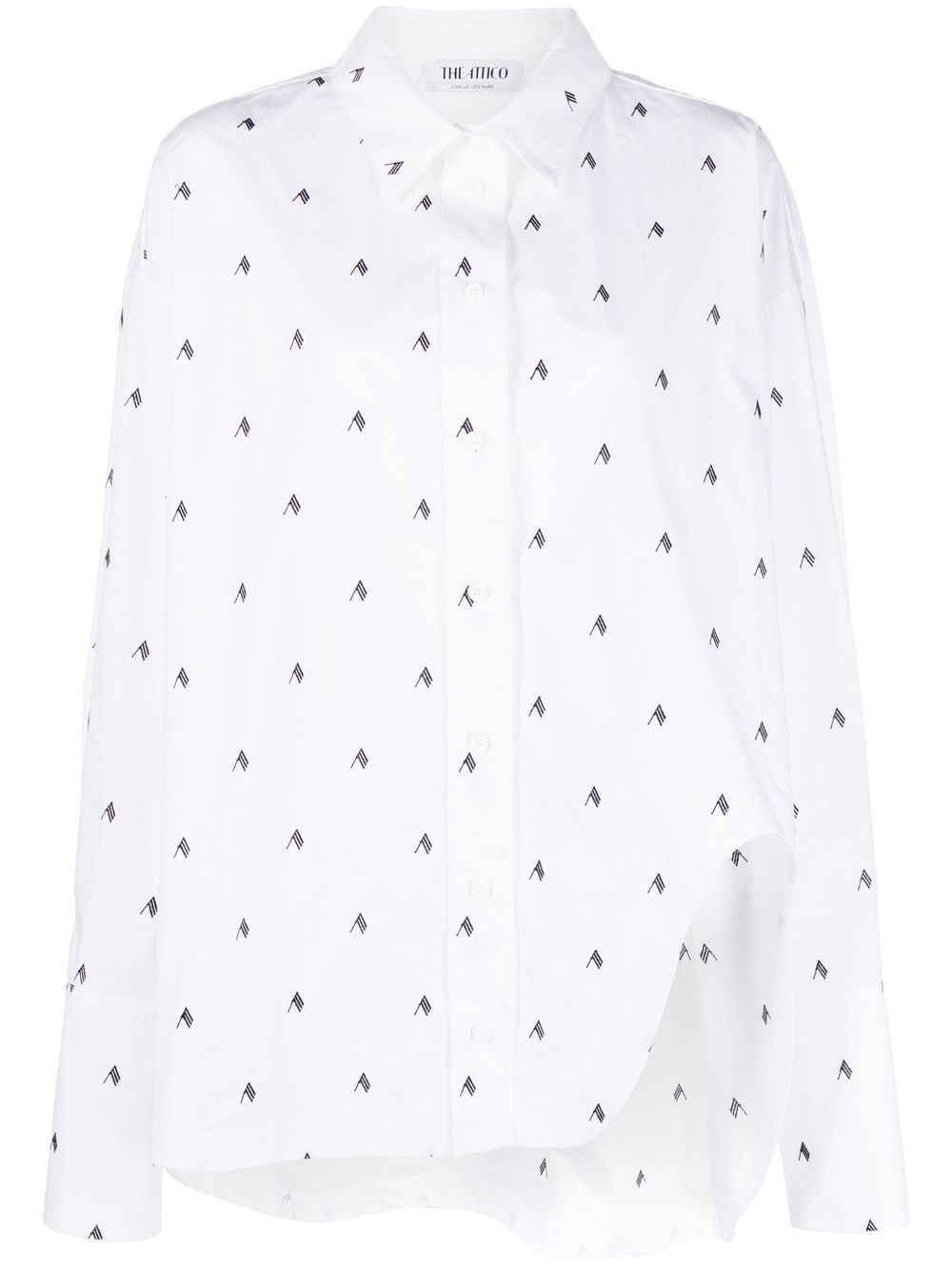 Diana oversized logo-print shirt The Attico's shirt offers a contemporary take on classic shirting. Cut for an oversized silhouette, this asymmetric iteration is decorated with an all-over logo print. Made in Italy Composition Cotton 100% SIZE & FIT Model measurements Height 5 ft 10 in(1.78 m) Bust/Chest 29.92 in(76 cm) Hips 34.64 in(88 cm) Waist 23.62 in(60 cm) FittingInformation This piece fits true to size. We recommend you get your regular size Cut for a loose fit Made with a mid-weight non-stretch fabric Washing instructions Machine Wash