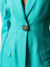 Donna jacket peacock green virgin wool-blend notched lapels chest welt pocket front button fastening embossed gold-tone buttons long sleeves Made in Italy Composition Lining: Cupro 100% Outer: Virgin Wool 97%, Elastane 3% SIZE & FIT Model measurements Height 5 ft 10 in(1.79 m) Bust/Chest 32.67 in(83 cm) Hips 35.43 in(90 cm) Waist 25.98 in(66 cm) Measurement SLEEVE LENGTH 24.4 in(62 cm) LENGTH 28.74 in(73 cm) BUST 33.07 in(84 cm) FittingInformation This piece fits true to size. We recommend you get your regular size Cut for a slim fit Made with a mid-weight fabric Washing instructions Dry Clean Only