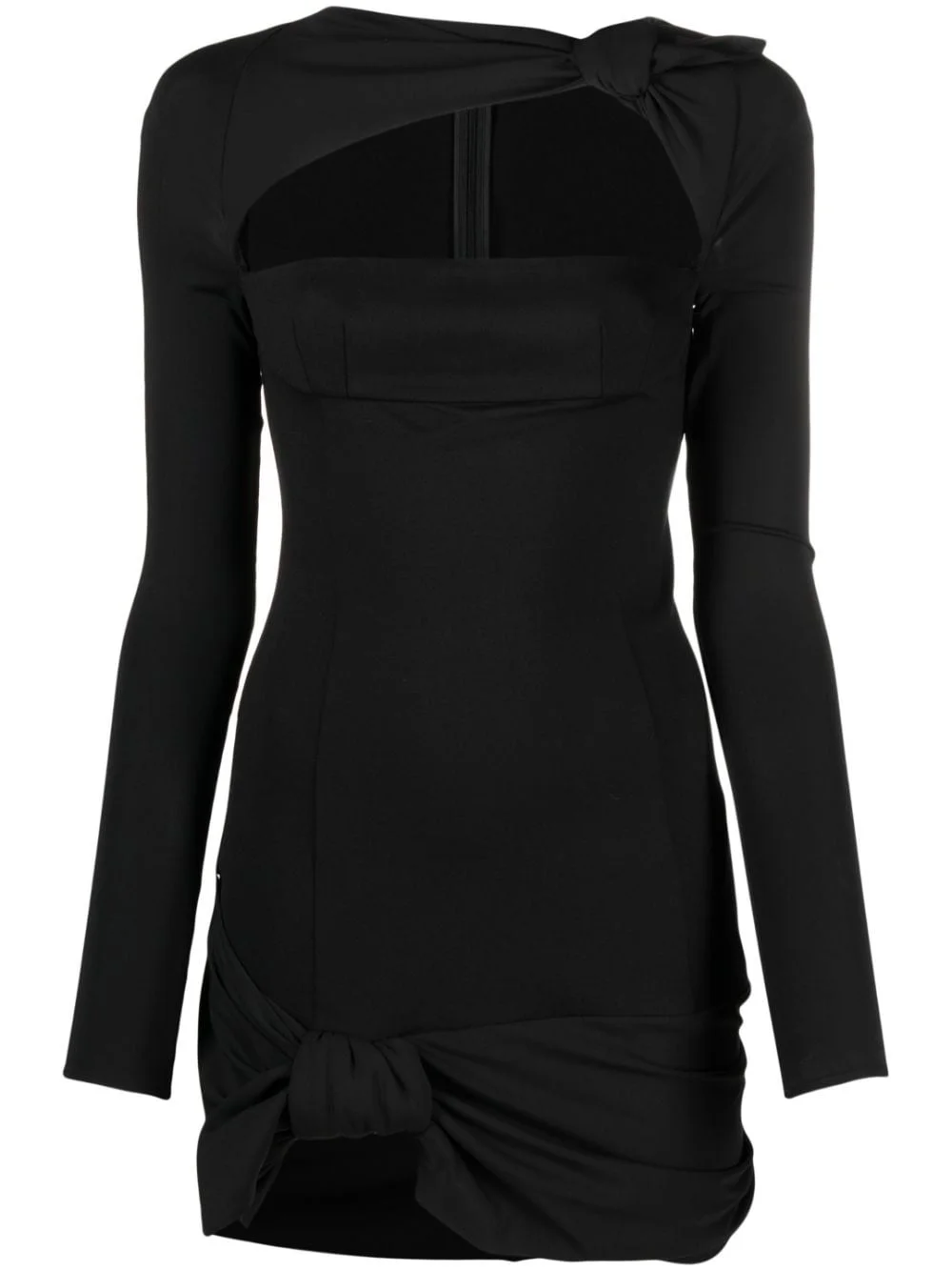 Donnie open-front minidress Channelling The Attico's contemporary style, this black form-fitting minidress is made unique with knot detailing at the shoulder and hem. Its open-front design adds a sultry touch. Highlights - Black - Stretch-jersey - Round neck - Open front - Knot detailing - Long sleeves - Calf-length Made in Italy Composition Outer: Acetate 75%, Polyamide 20%, other fibers 5% Lining: Viscose 68%, Polyamide 27%, Elastane 5% SIZE & FIT Model measurements Height 5 ft 10 in(1.77 m) Bust/Chest 29.92 in(76 cm) Hips 34.25 in(87 cm) Waist 23.62 in(60 cm) FittingInformation Designed for a close fit throughout Made from a midweight fabric This piece fits true to size – take your usual size Washing instructions Hand Wash