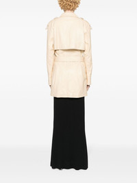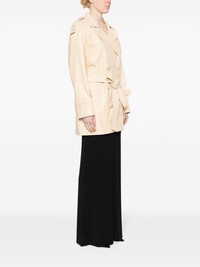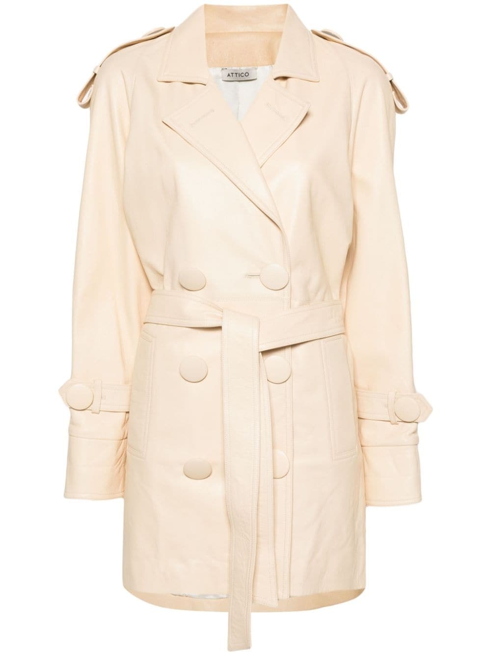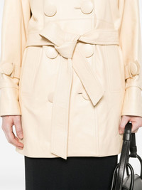 double-breasted leather coat Highlights - Ivory white - Sheepskin - Pebbled texture - Seam detailing - Peak lapels - Epaulettes - Long sleeves with buttoned cuffs - Two side welt pockets - Belt loops - Detachable waist belt - Full lining - Straight hem - Double-breasted button fastening Made in Italy Composition Outer: Sheepskin 100% Lining: Viscose 100% SIZE & FIT Model measurements Height 5 ft 9 in(1.75 m) Bust/Chest 34.64 in(88 cm) Hips 36.61 in(93 cm) Waist 26.37 in(67 cm) FittingInformation Designed to be unstructured, offering a loose fit throughout The tie fastening gives an adaptable and personalised fit Soft leather has a supple and smooth construction offering some flexibility This piece fits true to size – take your usual size