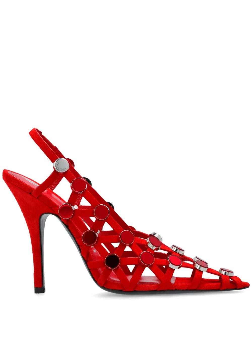 Grid 105mm leather pumps Highlights - Ruby red - Calf leather/goatskin - Engraved logo - Stud embellishment - Pointed toe - Elasticated slingback strap - Branded footbed - High stiletto heel - Leather sole Made in Italy Composition Outer: Goat Skin 100% Sole: Calf Leather 100% Lining: Goat Skin 100% SIZE & FIT Measurement HEEL 4.13 in(10.5 cm)