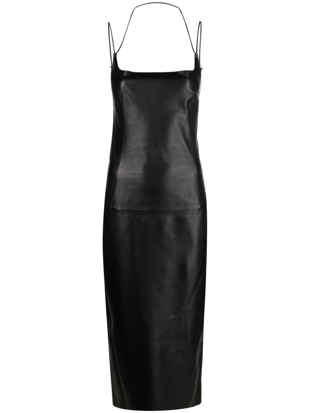 halterneck leather midi dress Italian label The Attico is renowned for its alluring silhouettes and monochromatic colour palettes, as evidenced by this midi dress. It's cut from supple black leather to a form-fitting silhouette and framed with slender shoulder straps that nod to lingerie styles. Highlights - Black - Lambskin - Smooth grain - Tonal stitching - Dart detailing at the chest - Halterneck - Square neck - Concealed rear zip fastening - Adjustable spaghetti straps - Sleeveless - Rear slit - Straight hem Imported Composition Lamb Skin 100% SIZE & FIT Model measurements Height 5 ft 11 in(1.8 m) Bust/Chest 32.67 in(83 cm) Hips 36.22 in(92 cm) Waist 24.4 in(62 cm) Measurement HIPS 32.28 in(82 cm) LENGTH 42.51 in(108 cm) WAIST 25.98 in(66 cm) BUST 25.98 in(66 cm) FittingInformation Designed for a slim fit that sits just away from the body offering a close yet comfortable fit The vented hem offers movement at the rear Soft leather has a supple and smooth construction offering some flexibility This piece fits true to size – take your usual size Washing instructions Specialist Cleaning