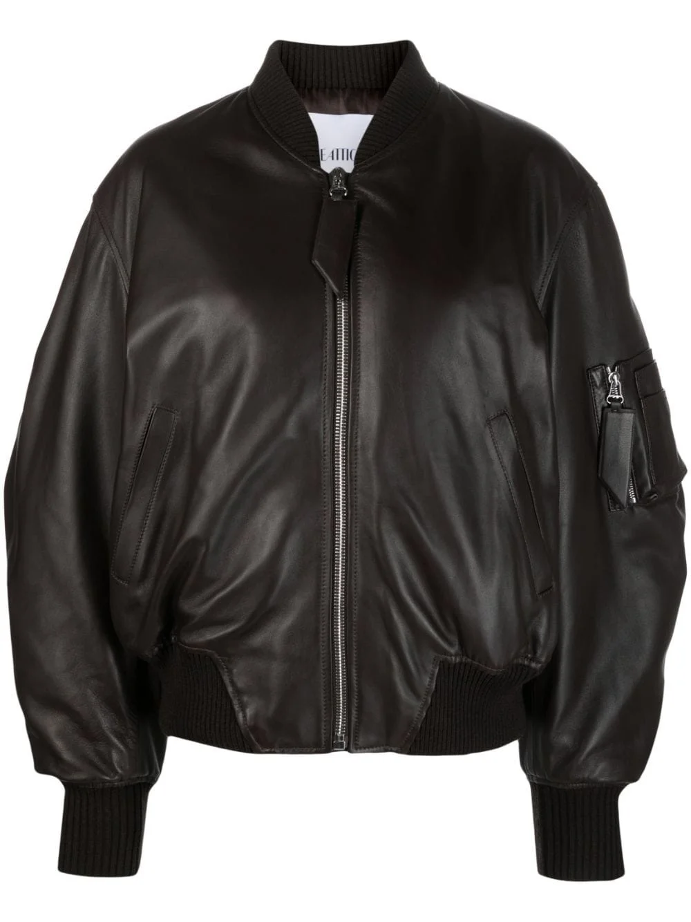 leather bomber jacket The Attico puts a characteristically playful twist on a classic bomber jacket. This outerwear piece is modernised by a leather construction and an oversized cut. Highlights - Brown - Lambskin - Ribbed band collar - Front zip fastening - Long sleeves - Sleeve zip pocket - Two side slit pockets - Ribbed cuffs and hem Imported Composition Lining: Cupro 100%, Cotton 100%, Polyester 100% Outer: Lamb Skin 100%, Wool 44%, Acrylic 44%, Polyamide 8%, Elastane 4% SIZE & FIT Model measurements Height 5 ft 9 in(1.75 m) Bust/Chest 31.88 in(81 cm) Hips 33.85 in(86 cm) Waist 24.01 in(61 cm) FittingInformation Designed for a boxy fit, intended for a loose fit throughout The elasticated hem allows for movement and a comfortable fit Firm leather offering little flexibility to maintain its durability and sturdiness This piece fits true to size – take your usual size Measurement SLEEVE LENGTH 25.51 in(64.8 cm) LENGTH 23.5 in(59.7 cm) WAIST 34.01 in(86.4 cm) Washing instructions Specialist Cleaning