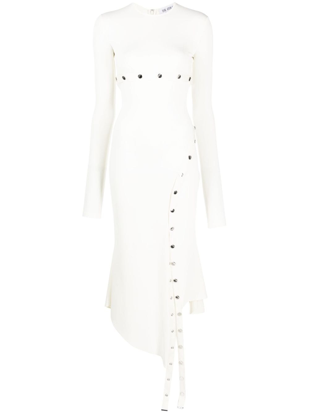 long-sleeve asymmetric midi dress Highlights - White - Jersey texture - Silver-tone hardware - Front slit - Grosgrain ribbon trim - Detachable panels - Round neck - Press-stud fastening - Concealed rear zip fastening - Long sleeves - Asymmetric hem Made in Italy Composition Acetate 75%, Polyamide 20%, other fibers 5% SIZE & FIT Model measurements Height 5 ft 11 in(1.8 m) Bust/Chest 30.7 in(78 cm) Hips 35.03 in(89 cm) Waist 24.4 in(62 cm) FittingInformation Designed for a close fit throughout Made from a midweight stretch fabric, this piece offers elasticity and flexibility when worn This piece fits true to size – take your usual size Measurement BUST 25.98 in(66 cm) LENGTH 52.99 in(134.6 cm) WAIST 20 in(50.8 cm) SLEEVE LENGTH 25.98 in(66 cm) HIPS 25.98 in(66 cm) Washing instructions Hand Wash