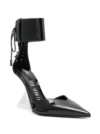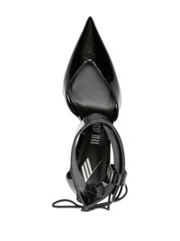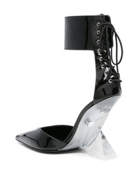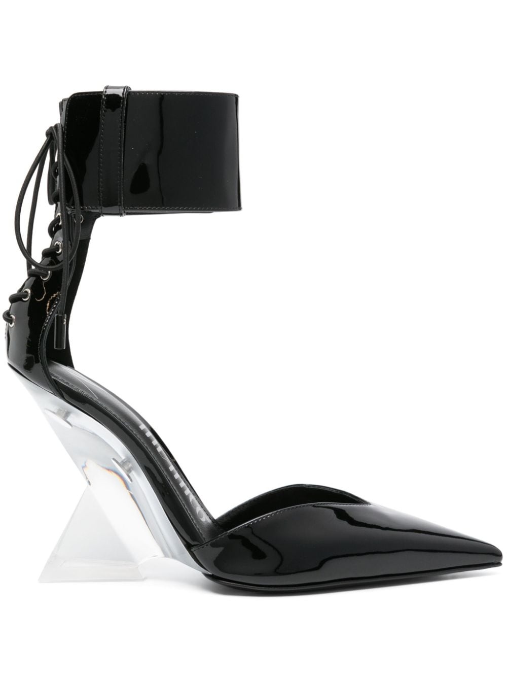Morgan 105mm lace-up pumps These black Morgan pumps reinforce The Attico’s reputation for sculptural footwear – they’re set on angular PLEXIGLAS® heels that are almost invisible from afar. They’re made from patent leather with wide ankle straps and adjustable laces for subversive edge. Highlights - Black - Calf leather - Patent finish - High sculpted heel - Rear lace-up fastening - Ankle strap - Pointed toe - Branded footbed - Leather outsole - Ankle touch-strap fastening Made in Italy Composition Sole: Calf Leather 100%, Rubber 100% Lining: Calf Leather 100% Outer: Calf Leather 100% SIZE & FIT Measurement HEEL 4.25 in(10.8 cm)